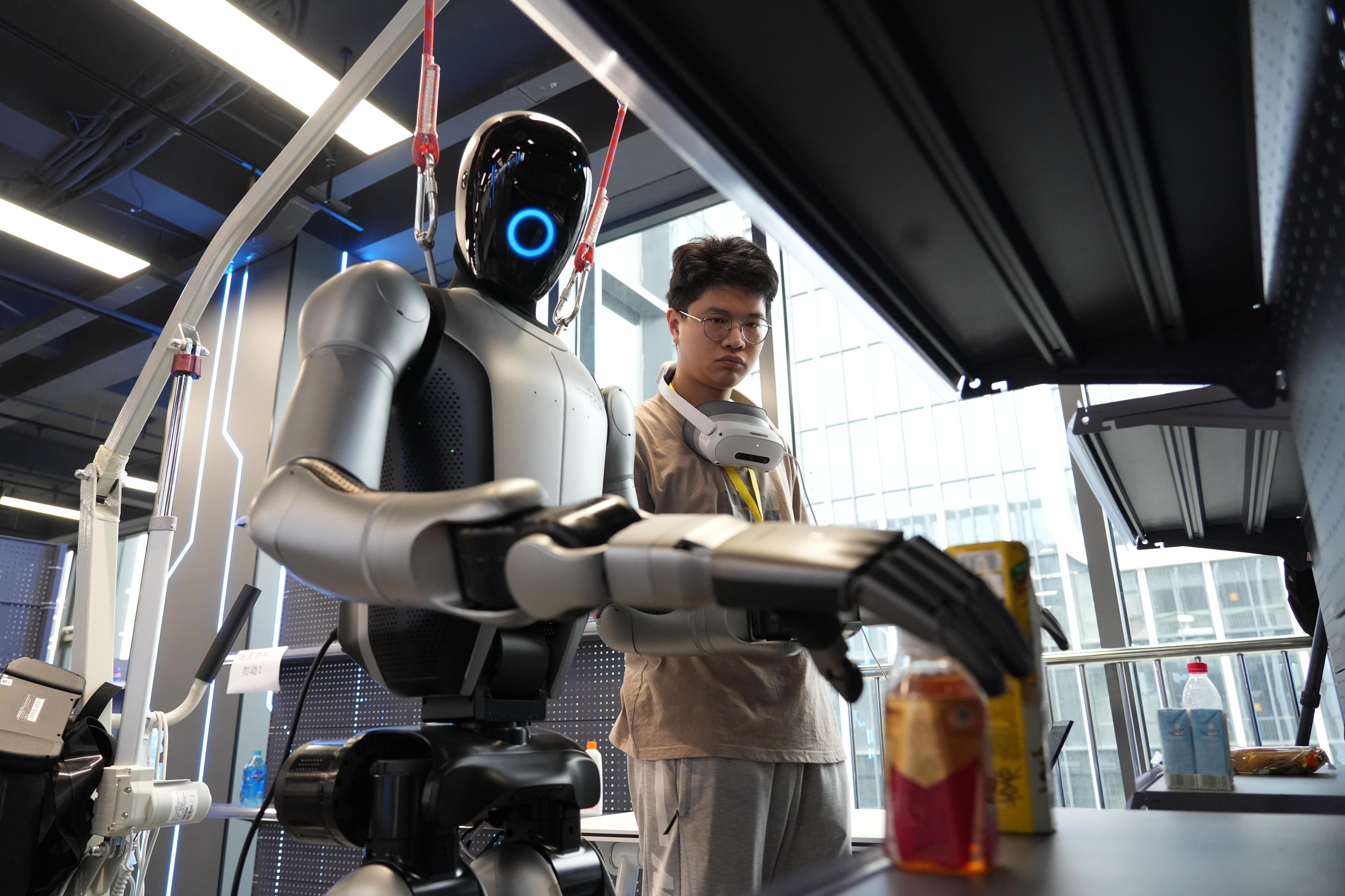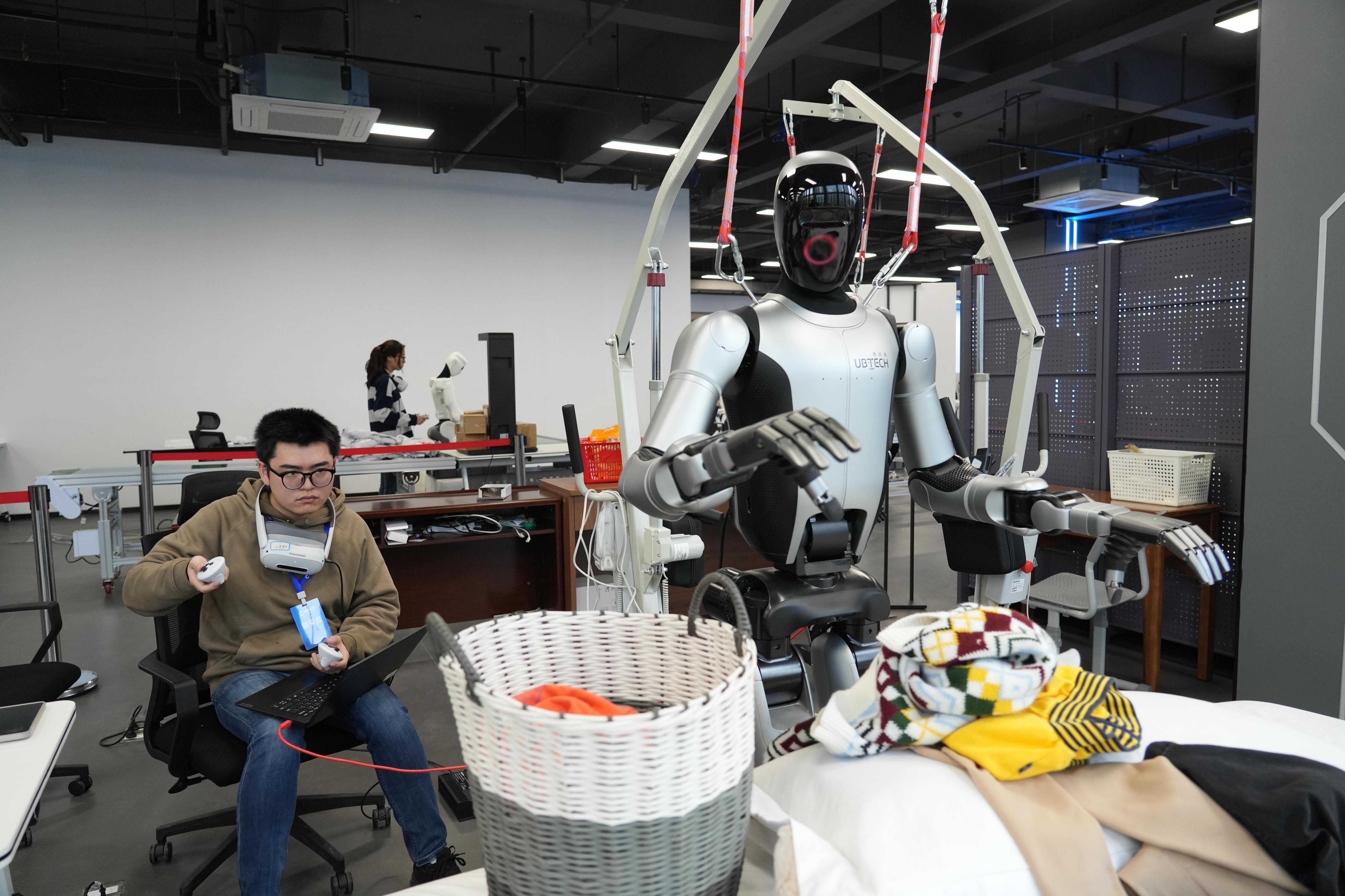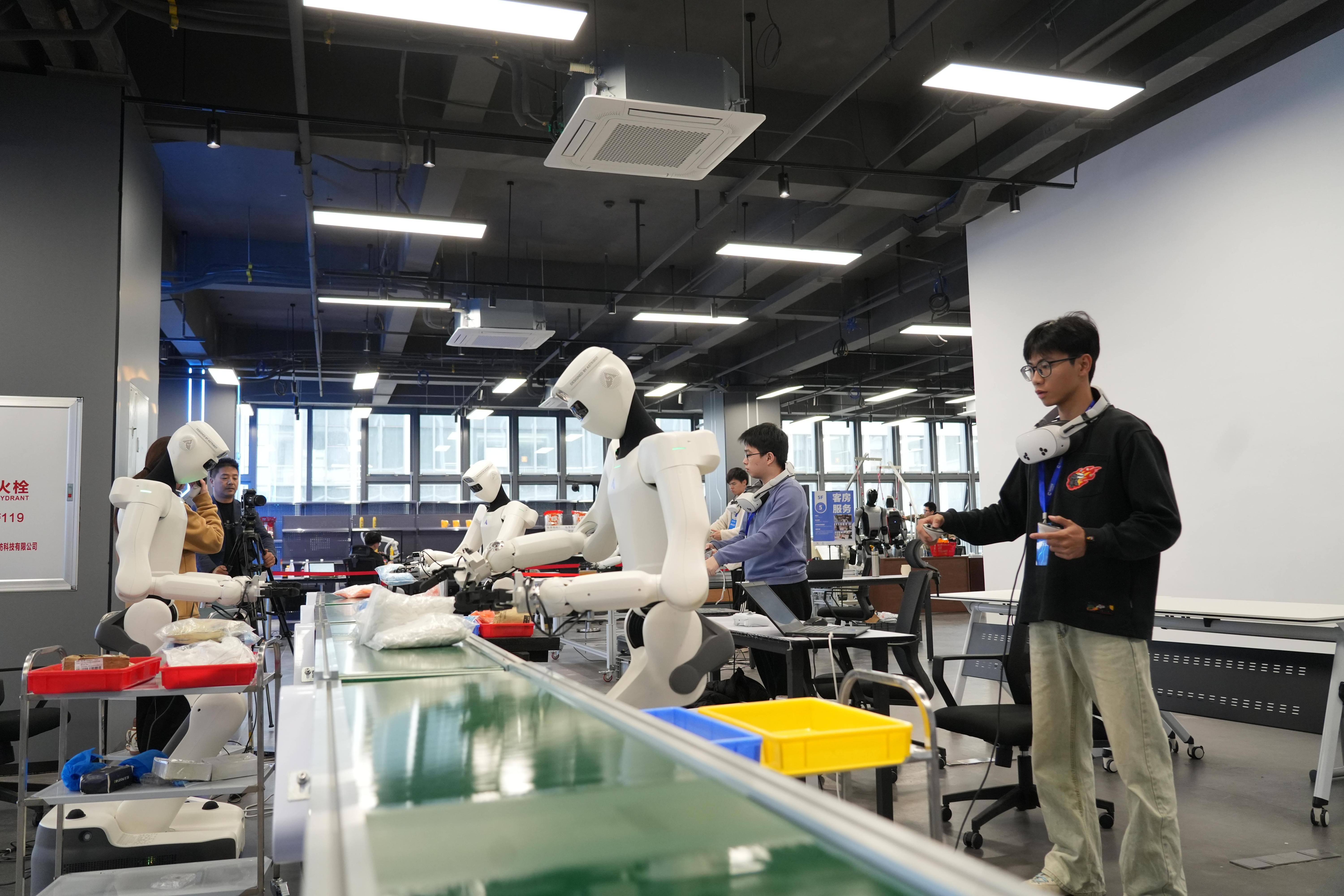 戴上AR眼镜,双手握住力反馈手柄,这些是机器人训练师身着的动作捕捉设备。“最初的工作是做数据标注,记录机器人的行为,一天的工作就是反复训练,收集图像、语音、文本等多模态数据,并上传至云端进行数据处理。”王钦熙说,训练师相当于机器人的“启蒙老师”,要引领机器人不断经历“犯错-修正-进化”的正循环。