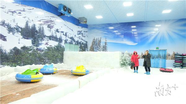 1月31日,阳光明媚,温度适宜,在户外玩耍的市民很多都换上了半袖,然而在惠阳区平潭镇的四季绿农业公园内,游客们却换上厚重的防寒服,穿上橡胶防滑鞋,走进了一个座大型蓝色冰雪屋,屋内满地积雪,飘着雪花,一旁还有冰雕做的房子,孩子们用橡皮汽艇在斜坡上滑雪,人们在堆满了雪的木屋前合影留念,仿佛真的来到了千里之外的冰雪世界。