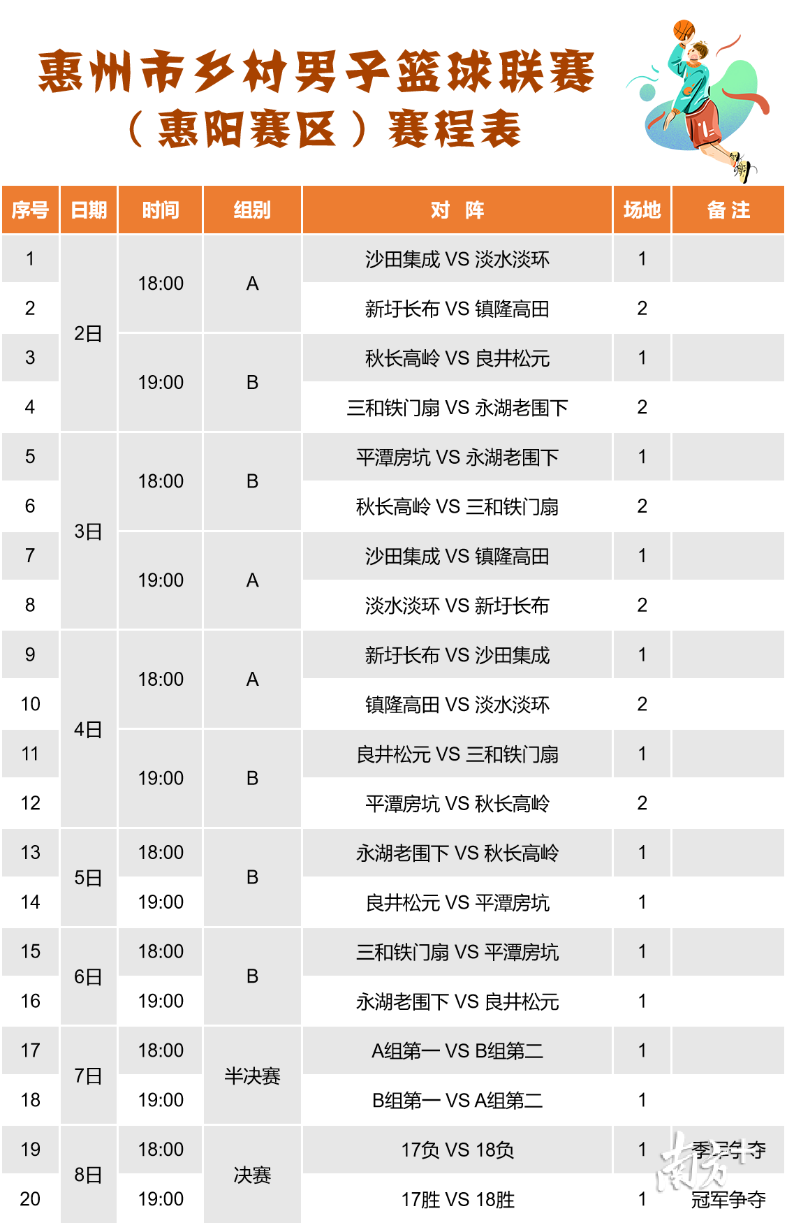 具体到赛事安排,该区篮球协会相关负责人介绍,比赛场地设置在惠阳区体育文化公园篮球场,赛事周期为12月2日至8日,每晚18时和19时整将准时名哨开赛,市民可提前申请入场观赛,为队员们加油助威。