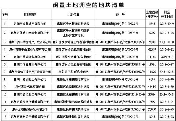 近日,惠阳区自然资源局发布新批次《闲置土地调查公告》。据公告的闲置土地调查地块清单显示,惠州市逸基地产有限公司、惠州市富信工业房产开发有限公司等13家企业共计涉嫌土地闲置面积25万平方米左右。