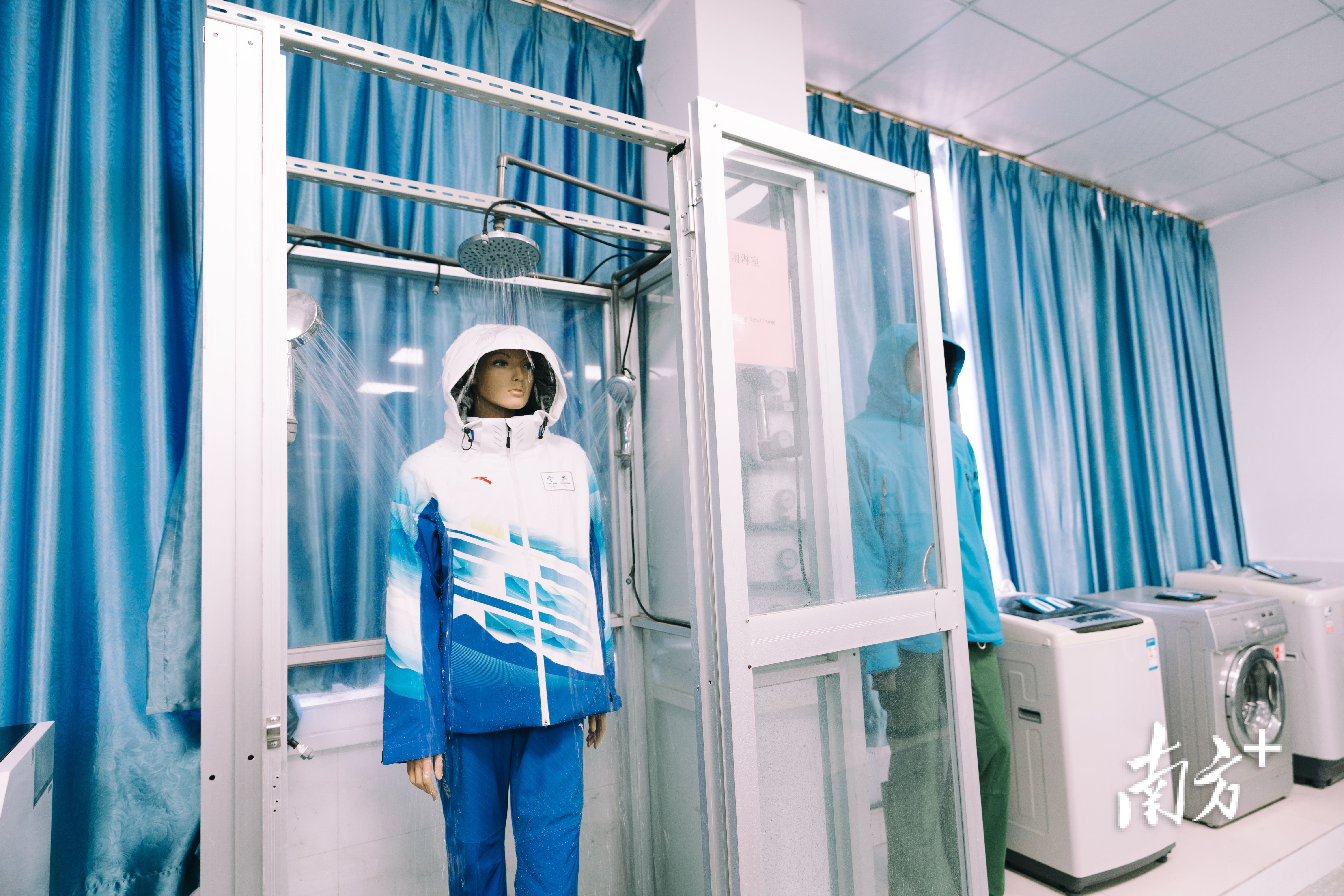 在惠州宏星制衣厂的检验室有个淋浴间,工作人员打开淋浴设备,给身穿冬奥会志愿者制服的模特淋了个澡,以模拟淋雨环境。关掉淋浴设备后,工作人员轻轻一抖,衣服上的水珠如同荷叶珠一般从衣服上滚落,拉开制服拉链,里面的棉质内衣依然干爽如初。