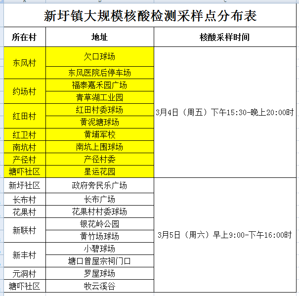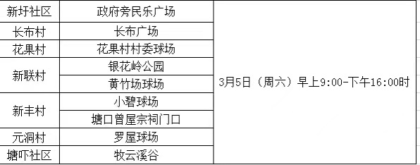 明天(3月5日,周六)早上9:00-下午16:00时,在新圩镇新圩社区、长布村、花果村、新联村、新丰村、元洞村开展大规模核酸检测工作。