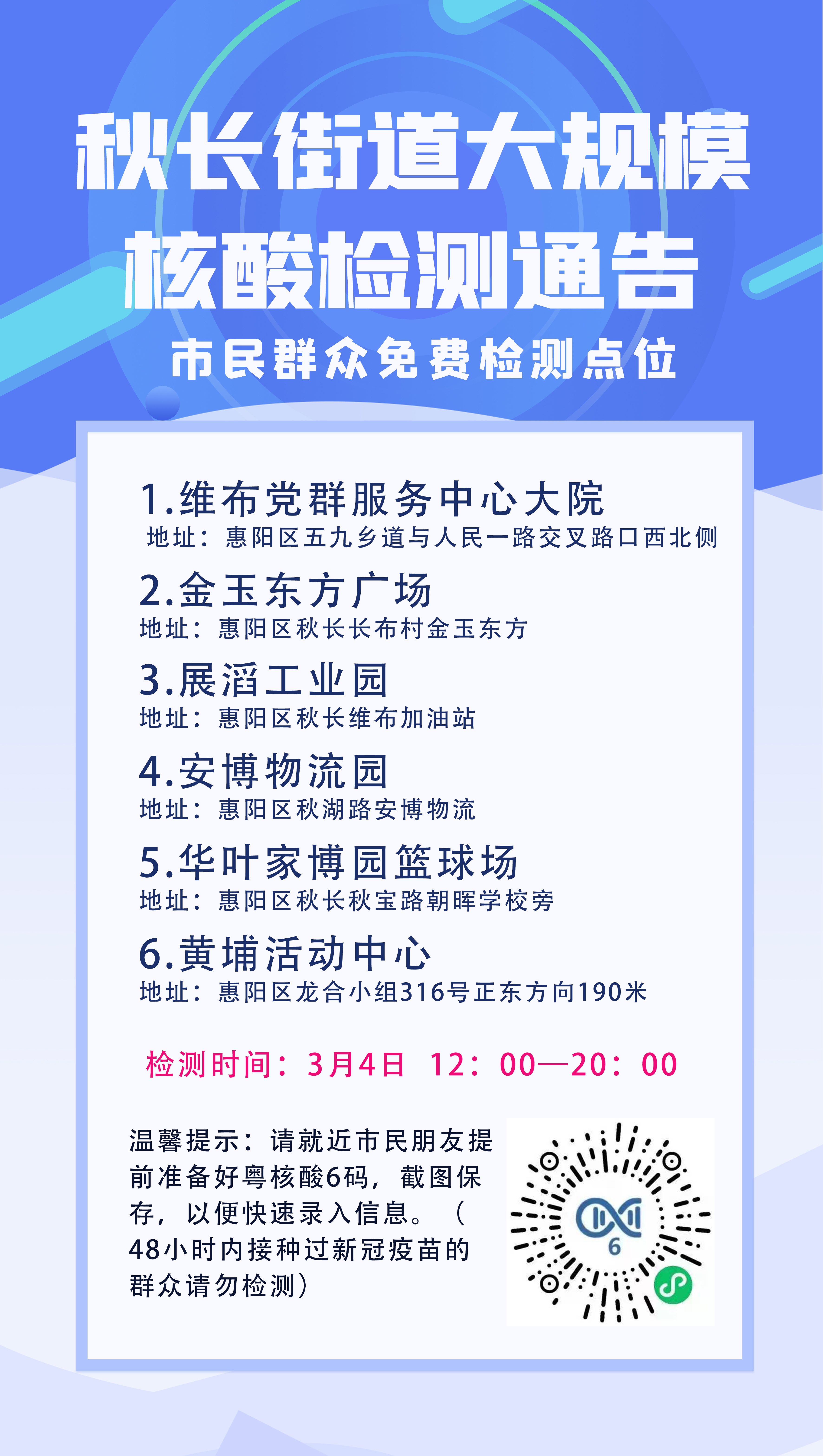 惠阳区秋长街道发布最新通告,3月4日 12:00-20:00开展大规模核酸检测,共设6个采样点。