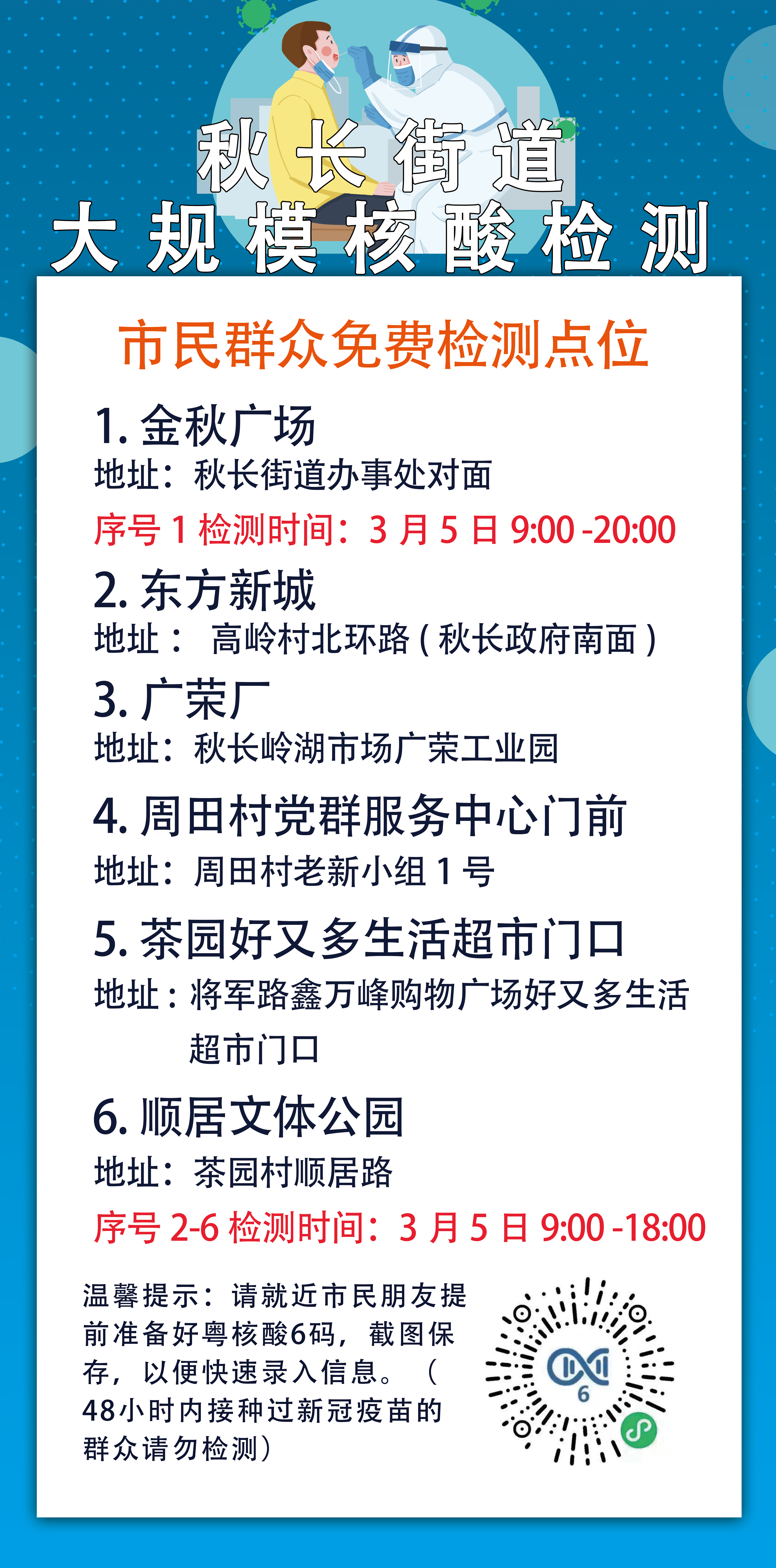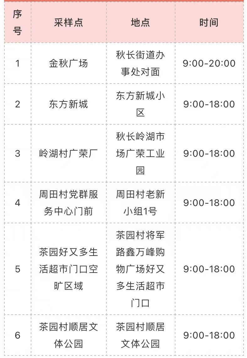 【明天继续!秋长3月5日设6个核酸采样点】
