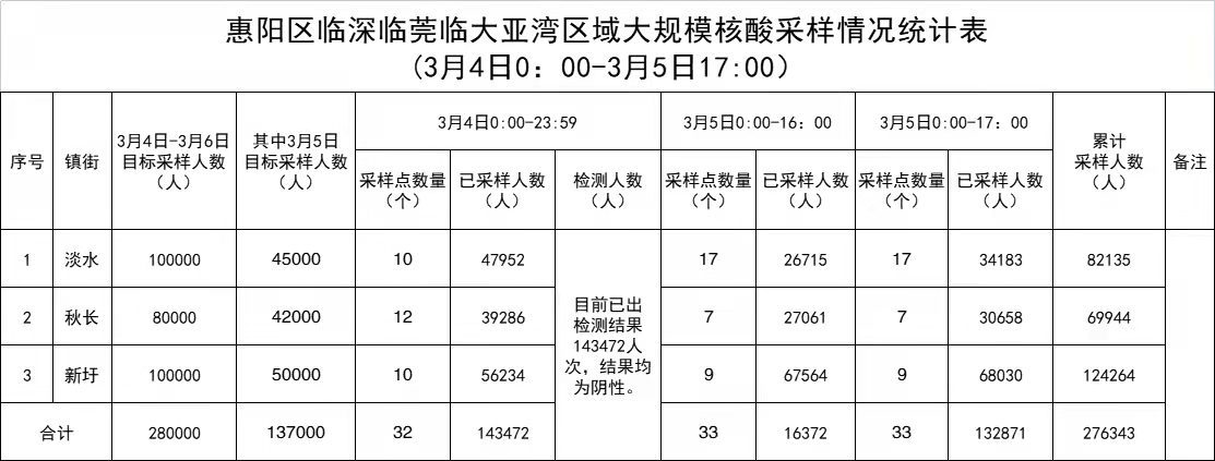 3月4日,惠阳区在临深、临莞、临大亚湾区域的淡水、秋长、新圩3个镇街道开展大规模核酸采样,共设采样点32个,采样通道102条,派出采样员176人、其他工作人员566人,目标采样13.8万人(其中淡水、新圩各5万人,秋长3.8万人)。截至20时,已采样136564人次(其中淡水47642人次、秋长38909 人次、 新圩50013人次)。