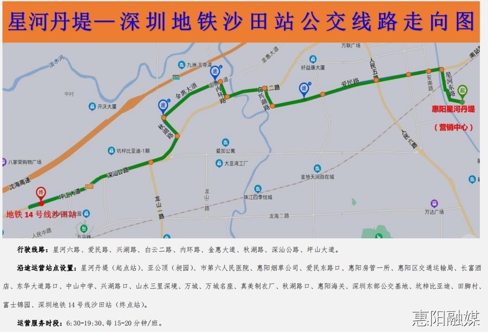 11月3日起,深惠2支线也将从原来惠阳星河丹堤至深圳龙岗回龙埔,调整为惠阳星河丹堤至深圳地铁14号线沙田站,该线路取消深圳段深圳地铁14号线沙田站至龙岗回龙埔路段及站点,线路站点由19个增至29个。线路里程由44公里调整为15公里,服务时间为6时30分至19时40分,充分满足市民当天往返惠深两地工作生活的需求。