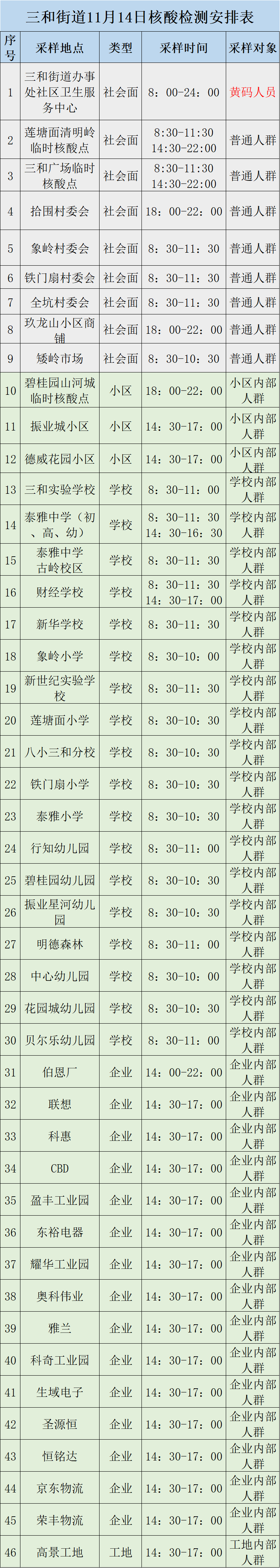 惠阳区三和街道11月14日在重点区域开展核酸检测,设立46个核酸采样点,包括黄码人员采样点。