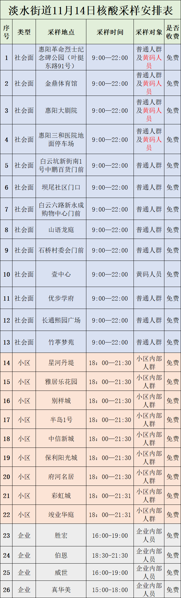 根据新冠肺炎疫情防控需要,11月14日,惠阳区淡水街道、秋长街道、新圩镇、三和街道开展免费核酸检测。其中,淡水街道设26个核酸采样点,秋长街道设8个社会面采样点,新圩镇设16个采样点,三和街道设46个采样点,共计近百个,包括部分黄码采样点。
