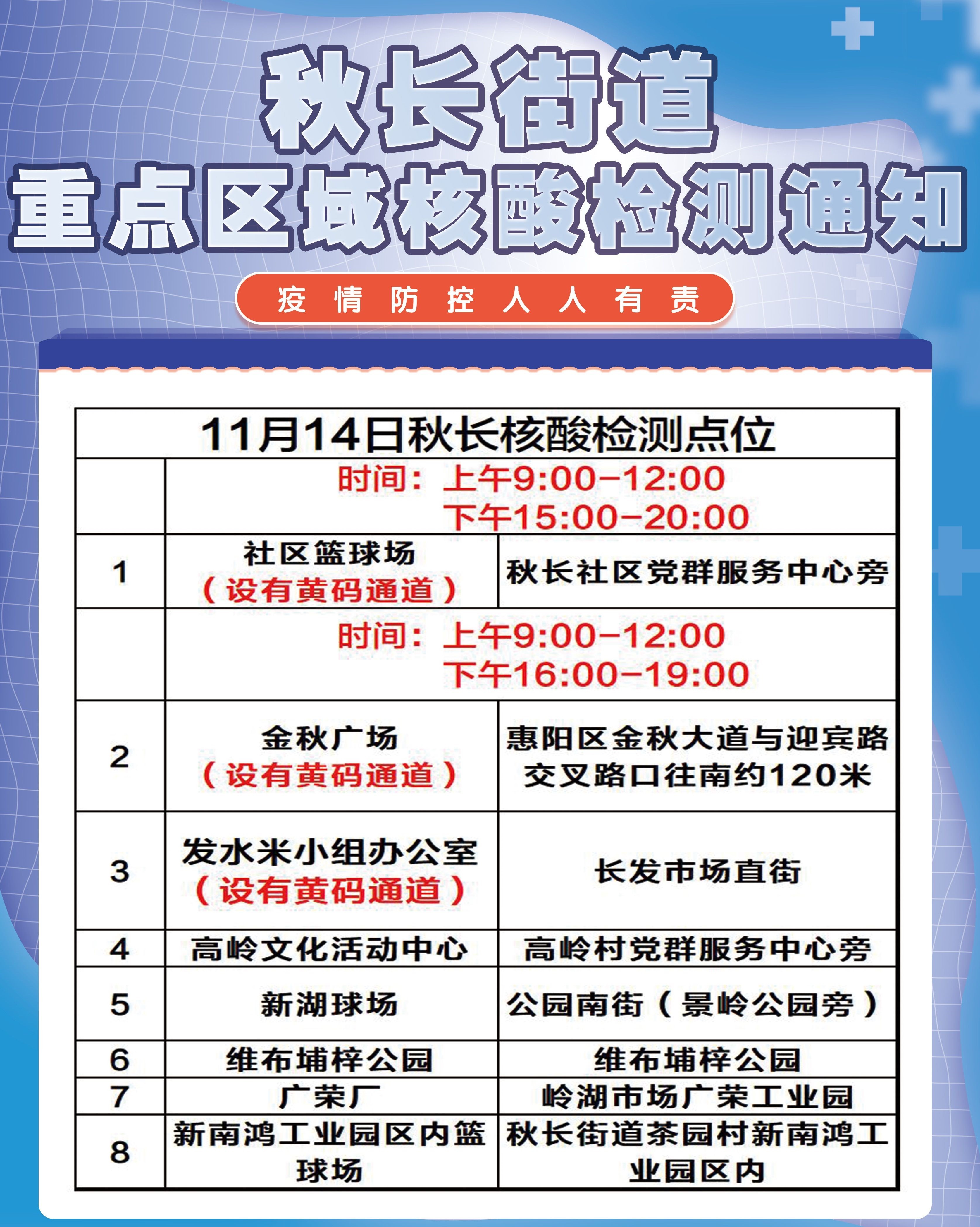 惠阳区秋长街道11月14日开展重点区域核酸检测,设8个社会面采样点,包括黄码采样通道。
