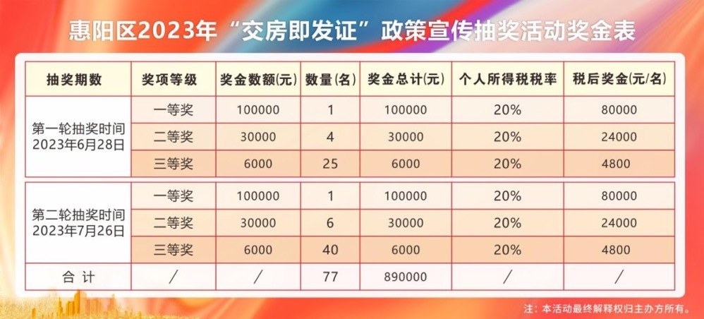 近日,惠阳启动2023年“交房即发证”政策宣传抽奖活动,只要在2023年5月20日—7月20日活动期间缴纳契税,即可自动参与“交房即发证”抽奖活动,抽取活动奖励,奖金最高为10万元。
