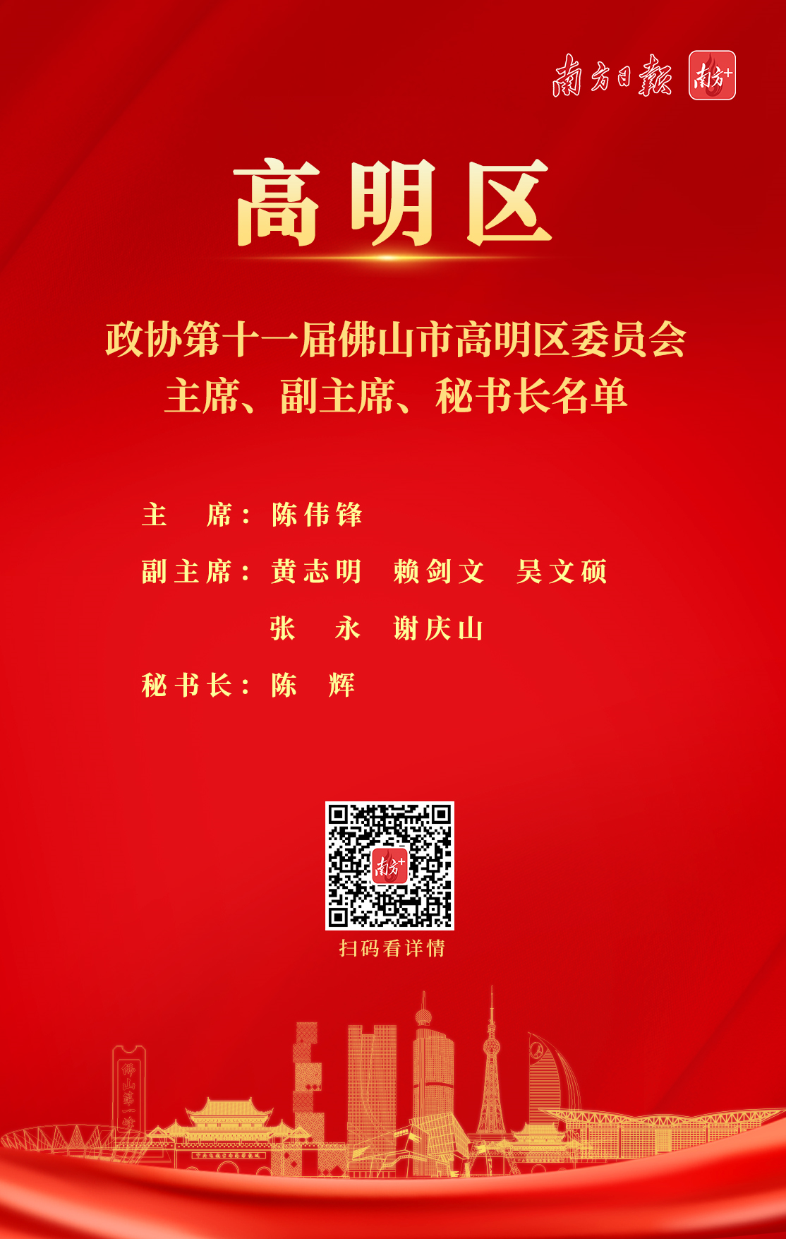 大会选举黄志明、赖剑文、吴文硕、张永、谢庆山等5人为政协第十一届佛山市高明区委员会副主席。陈辉当选为政协第十一届佛山市高明区委员会秘书长。