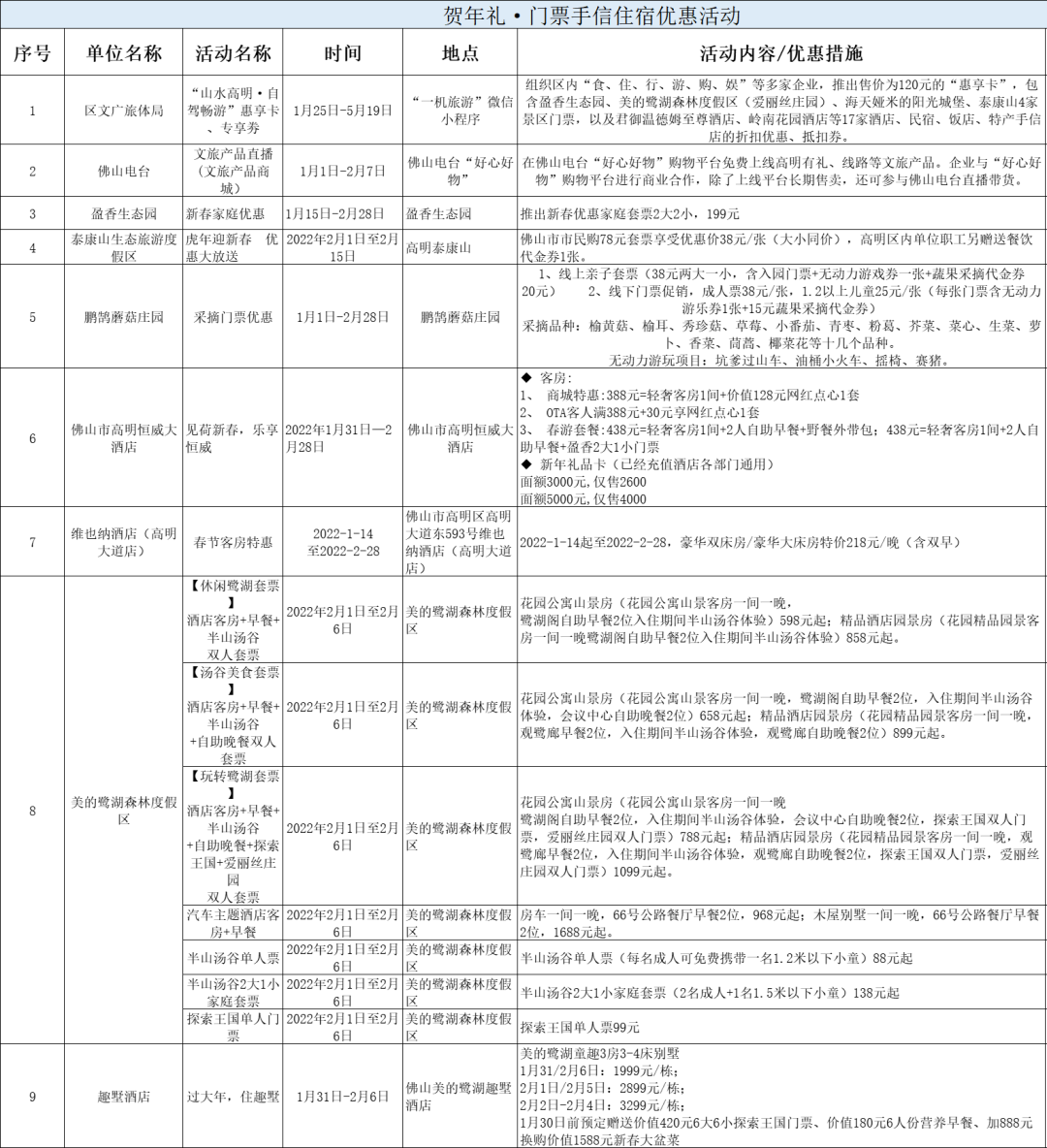 盈香生态园的新春家庭优惠、鹏鹄蘑菇庄园的采摘门票优惠、泰康山生态旅游度假区的亲子套票、维也纳酒店(高明大道店)的春节客房特惠等一系列涵盖吃住行游购娱的惠民举措,将陪伴游客度过一个暖心愉快的春节。
