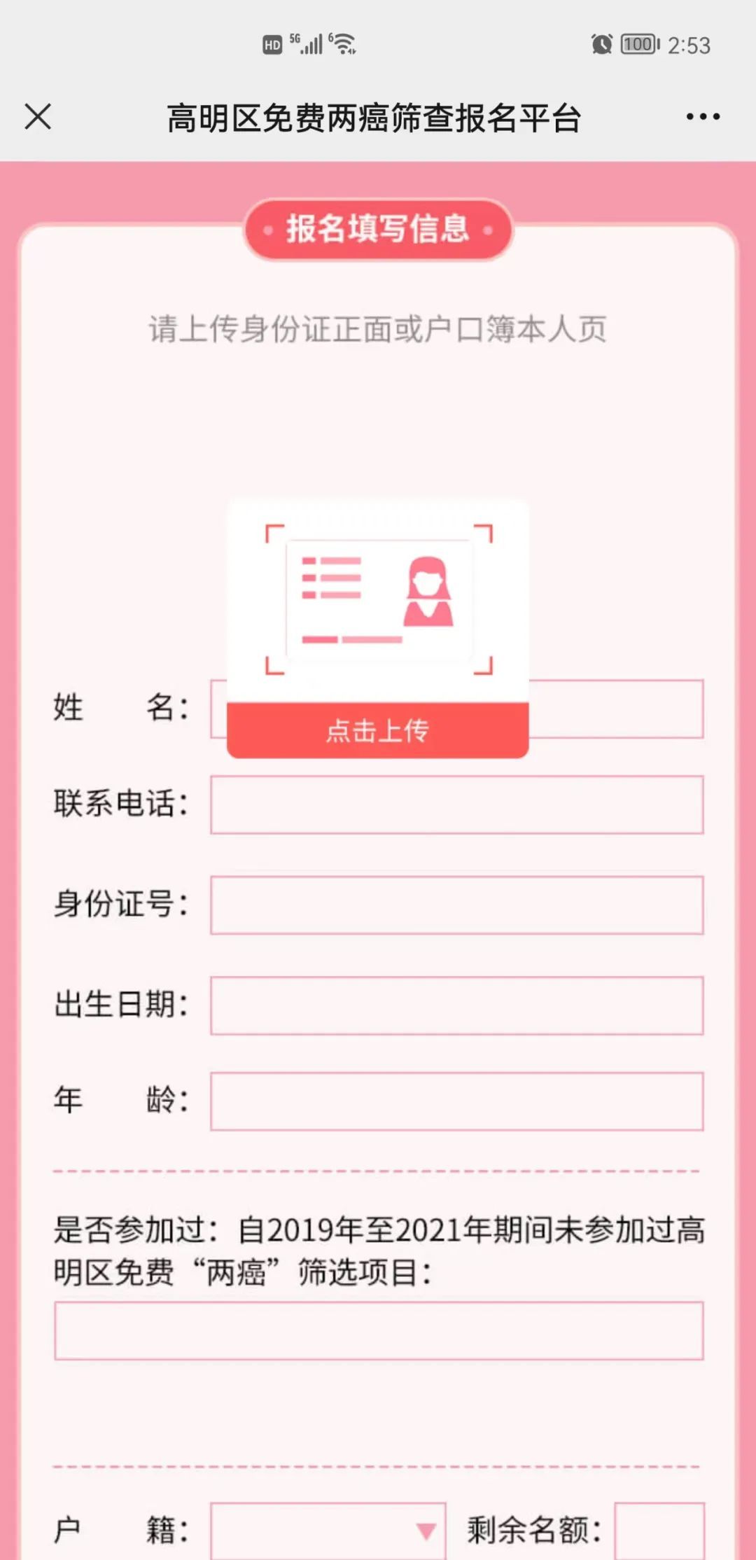 2、在报名填写信息中点击【点击上传】,上传【身份证】或【户口簿】中含有户籍或地址的页面,系统将自动识别或选填与本镇(街道)的名额匹配,额满为止。请务必填写真实联系电话,以便通知。
