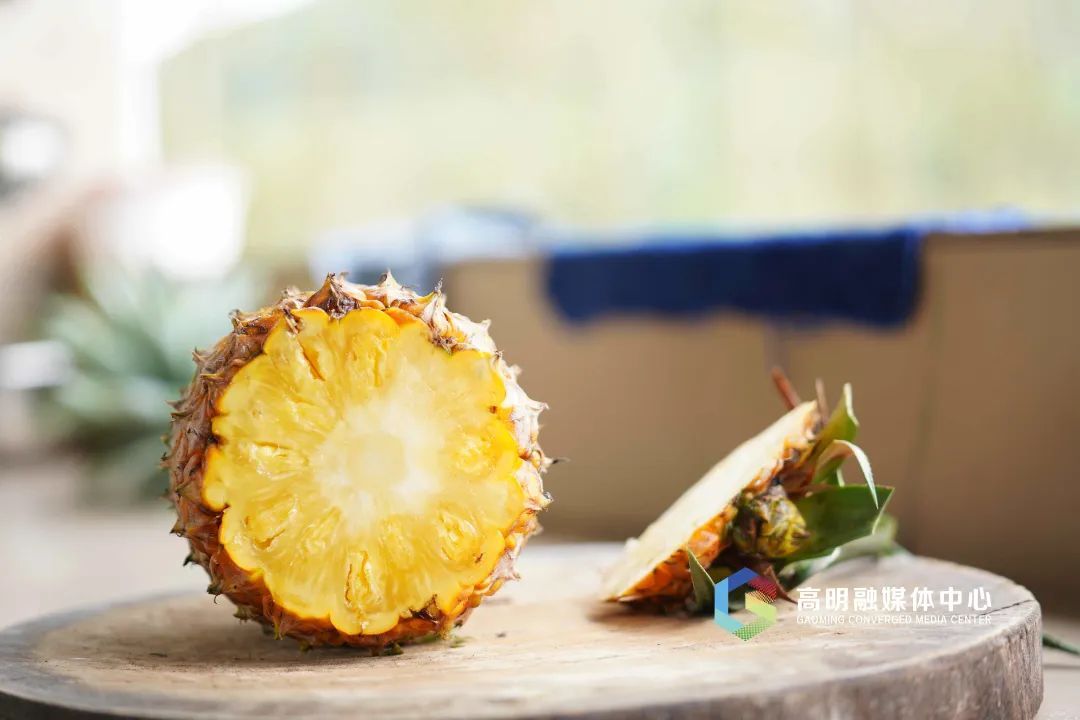 熟透的冰糖凤梨,金灿灿外皮中透着橙红,放到鼻子前一闻,热带水果标志性的热烈甜香扑面而来,将夏天的炎热都一扫而光~收割好的冰糖凤梨。