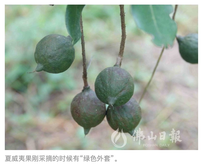 绿油油的夏威夷果街坊们见过吗?我们日常买到的夏威夷果大多数是“穿着褐色外套”,但是,夏威夷果刚采摘的时候是有“绿色外套”的。