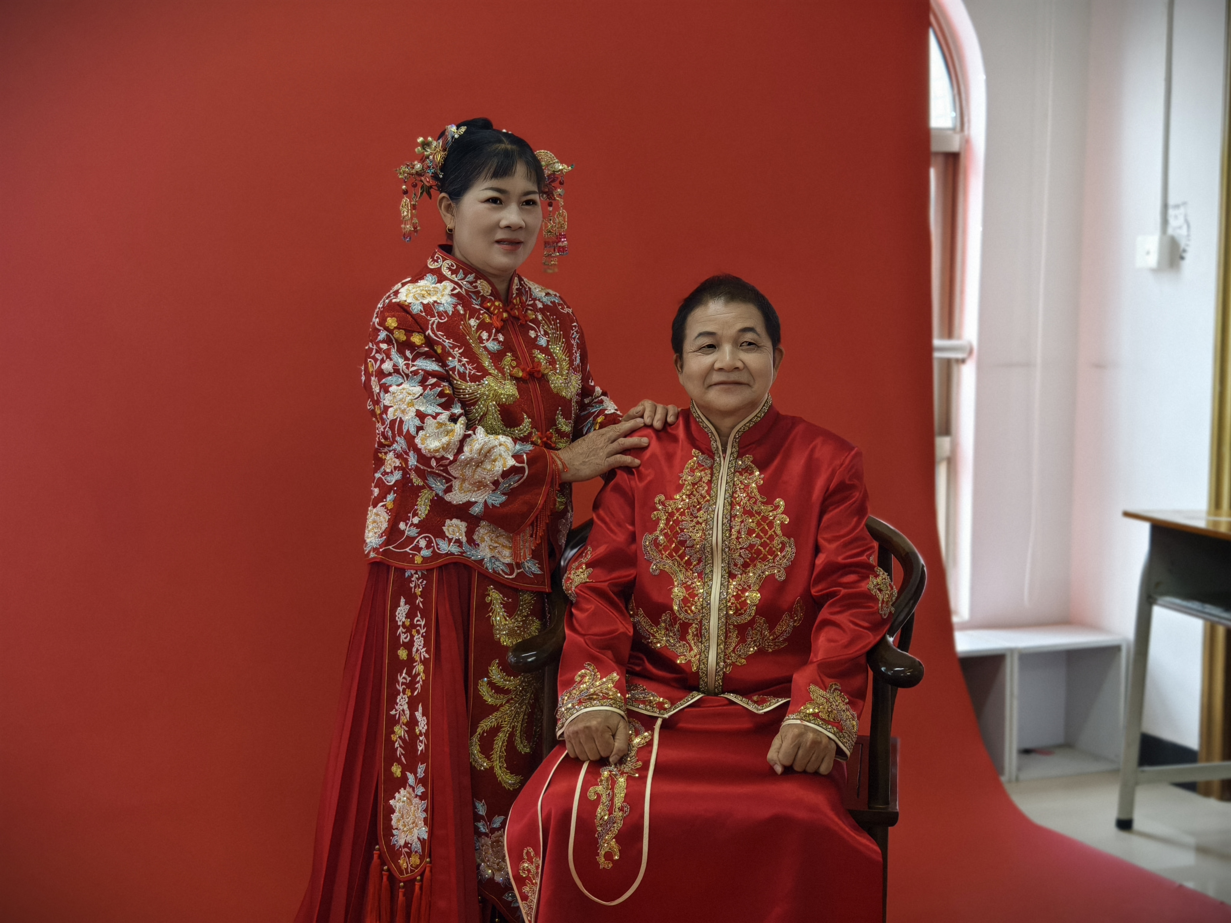“3、2、1…笑一个。”10月30日,在东莞黄江镇长龙社区综合服务中心,社区10对金婚、银婚老人在摄影师的指导下牵手相拥,在聚光灯下补拍迟到50年的结婚照。