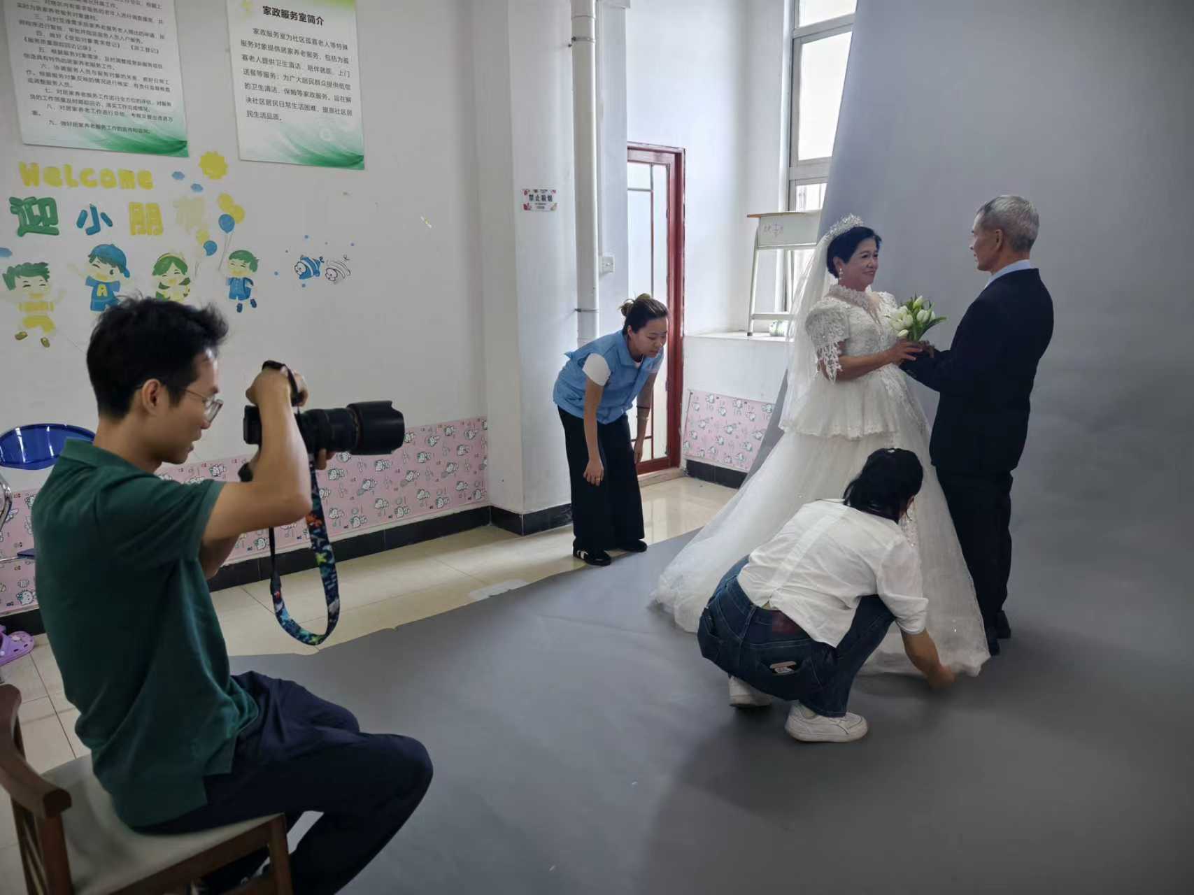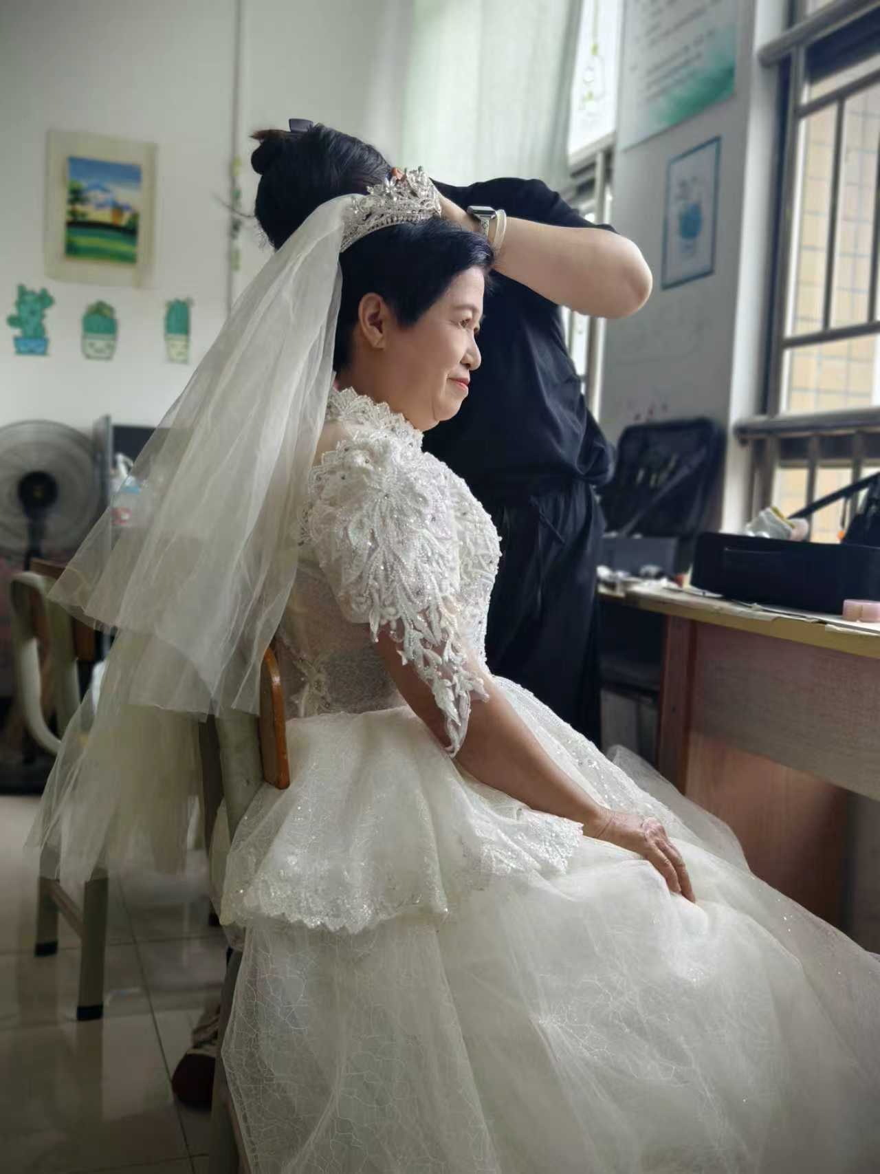 长者们在社工、工作人员和化妆师的帮助下换上喜庆礼服,平均年龄70多岁的他们相互整理领结、抚平衣角,仿佛回到半个世纪前的青春年华。“当年领完证就下地干活,连张合影都没拍,今天终于圆梦了!”72岁的叶爷爷开心地紧握着妻子的手。
