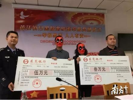 1月18日上午,在东莞黄江镇扫黑除恶线索举报奖励仪式上,两名“面具侠”低调现身,领走了8万元涉黑恶举报奖励金。