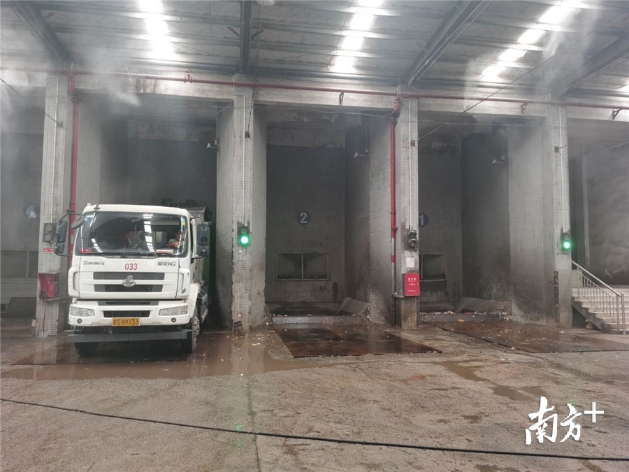 现场可以看到,经过检查计量的垃圾收集车会在自动交通指挥系统的指挥下进行卸料。在卸料的同时,位于接料漏斗上方的自动感应系统会启动除尘除臭系统喷洒水雾降尘,抽风系统会将臭气引入除尘除臭系统设备,处理后的气体达标排放。