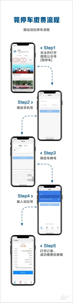 关注“莞停车”微信公众号,注册用户,输入停车泊位编号,自助缴纳停车费。此外,还可以下载“东莞通”APP,通过“东莞通”APP莞停车缴费模块自助缴纳停车费。市民可在“莞停车”微信公众号或“东莞通”APP中开通无感支付,实现快捷停车、秒速离场。