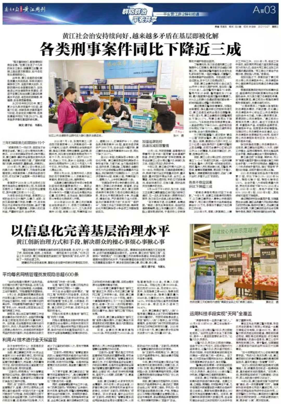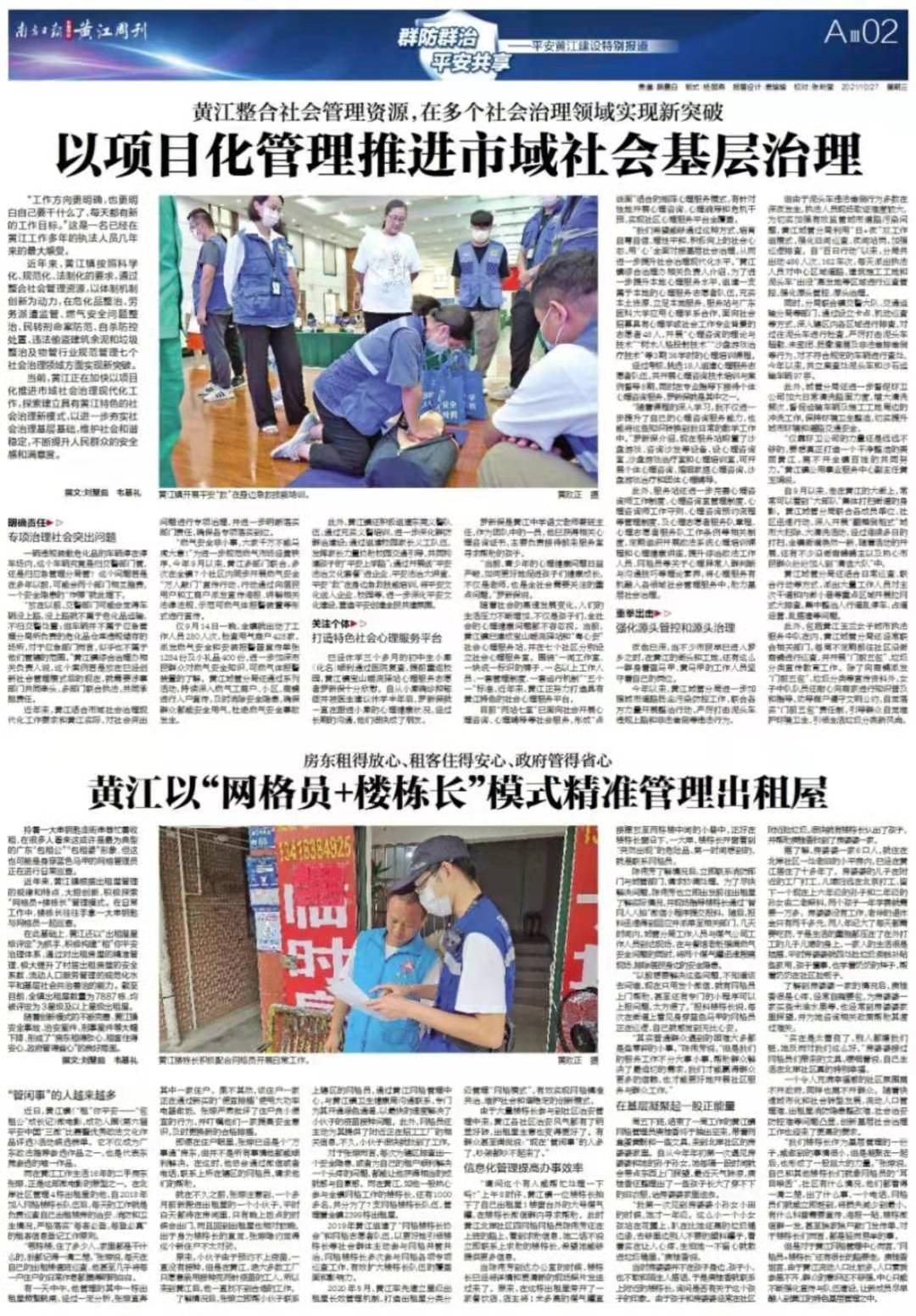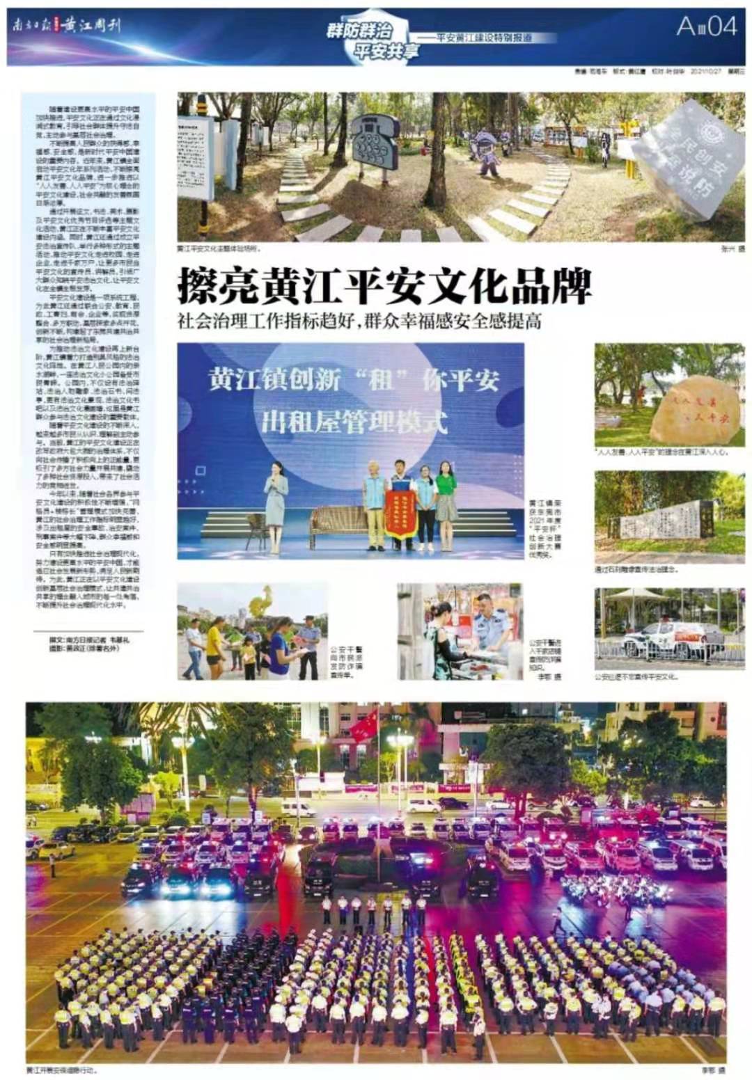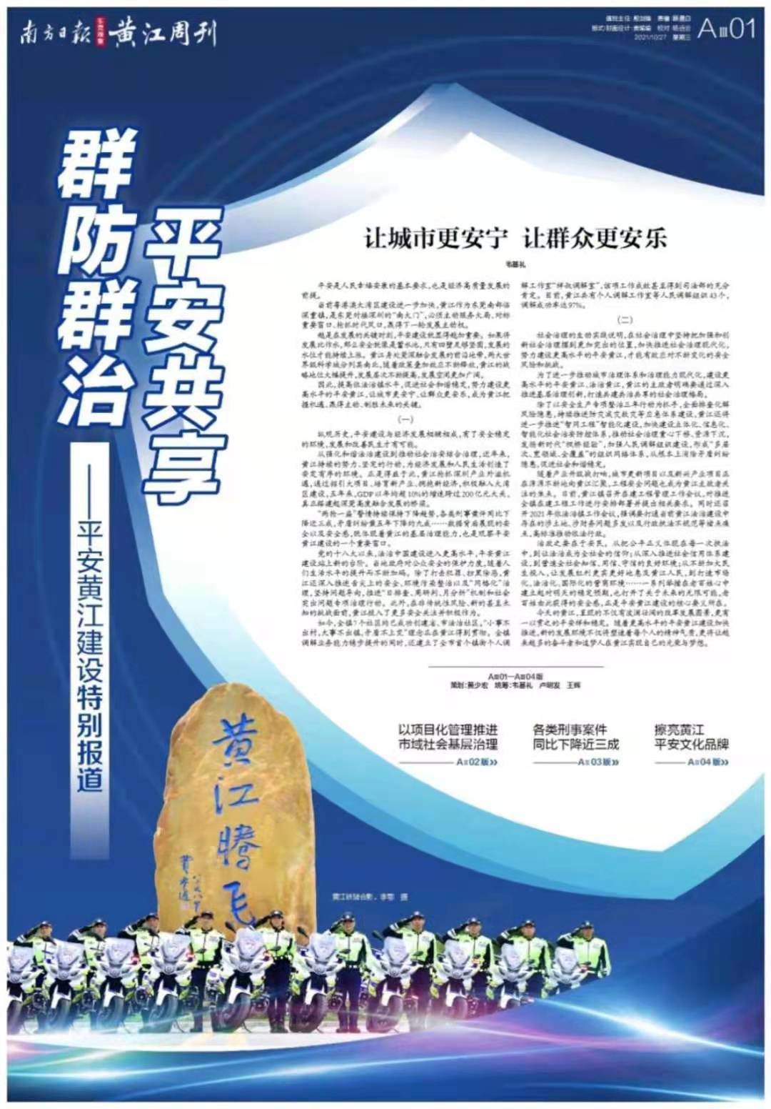 提高依法治镇水平,促进社会和谐稳定,努力建设更高水平的平安黄江,让城市更安宁、让群众更安乐,成为黄江把握机遇、赢得主动、制胜未来的关键。为此,南方日报推出4个版特别报道。