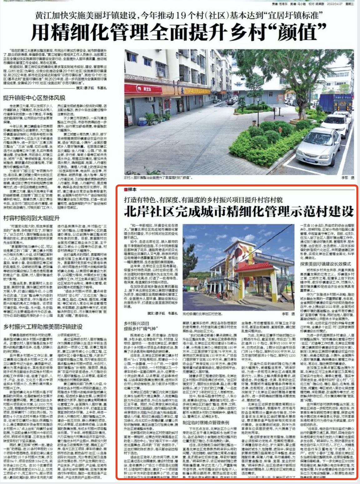 为进一步巩固美丽乡村建设、人居环境整治提升、“城市精细化管理示范村(社区)”打造等工作成果,北岸社区根据《黄江镇美丽圩镇建设攻坚行动方案》,制定《北岸社区美丽圩镇建设攻坚行动方案》,将通过微改造、小提升,全面提升人居环境质量,确保精细化管理工作全域化、常态化,推动美丽圩镇建设。