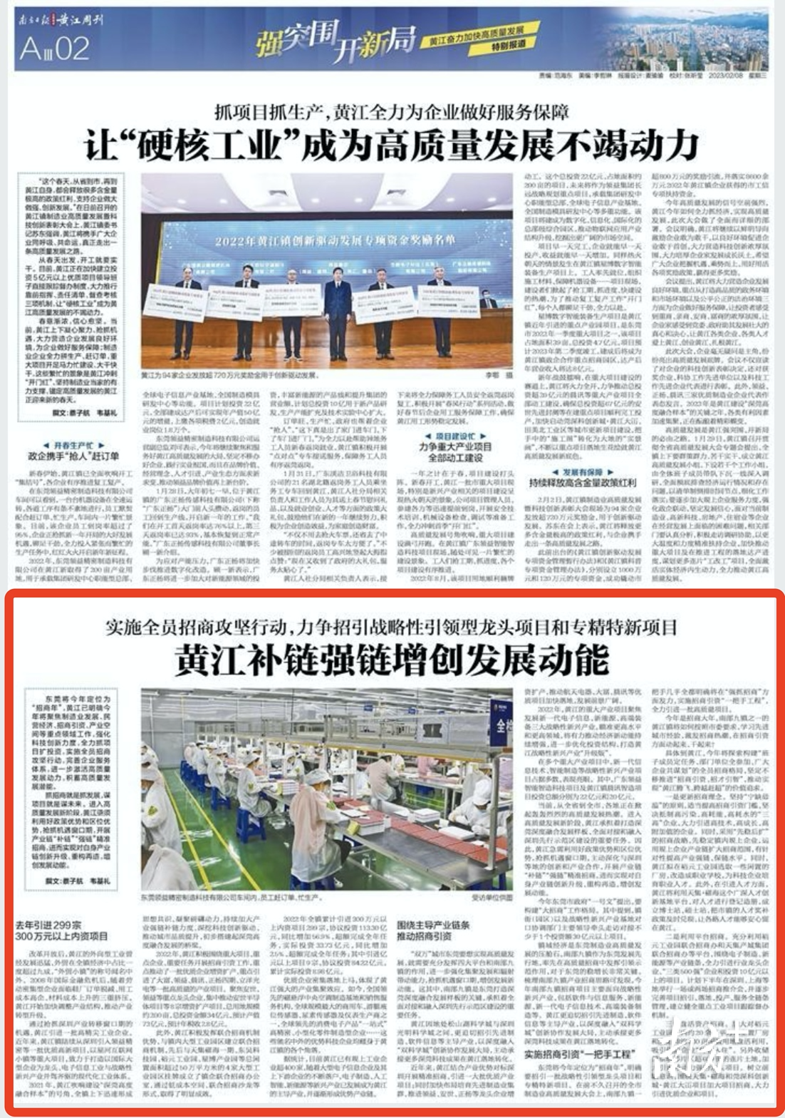 2022年,黄江积极围绕重大项目、重点企业、重要任务开展招商引资工作,重点推动了一批优质企业增资扩产,重点引进了大富、领益、晨讯、正扬四期、立洋光电等一批高质量的产业项目。聚焦安世、领益等重点龙头企业,集中推动安世半导体项目等8宗增资扩产项目,总用地规模约200亩,总投资金额34亿元,预计产值73亿元,预计年税收2.8亿元。