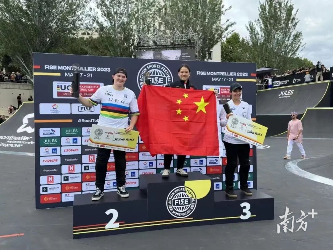 5月21日,法国蒙彼利埃2023FISE世界系列赛第二站暨UCI自由式BMX世界杯,中国队女子自由式BMX选手周惠敏以优异的表现成功在世界级大赛夺得冠军。