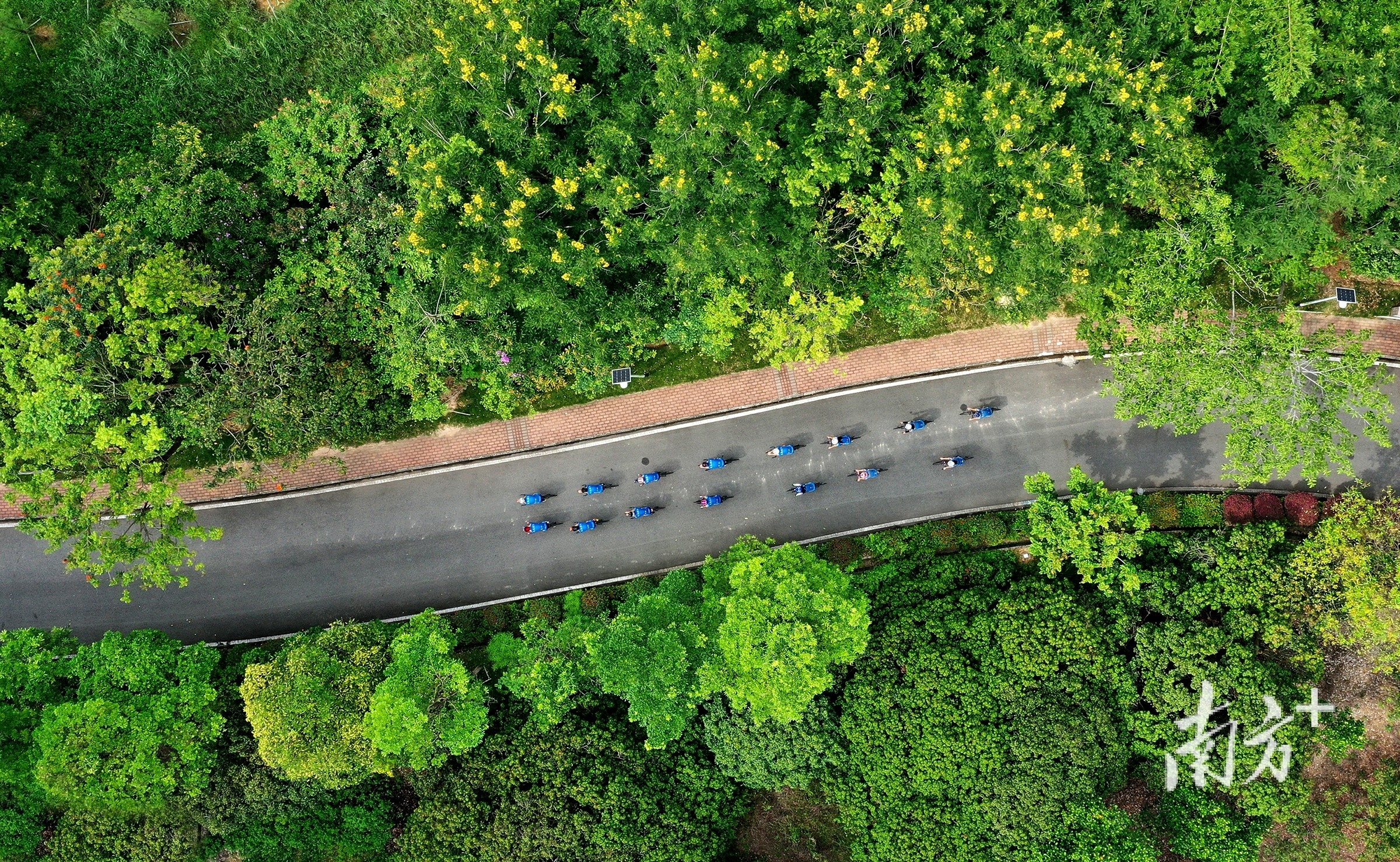 在黄江镇黄牛埔森林公园绿道,不少晨练的市民常常会与同样在绿道晨训的黄江自行车队偶遇。身着蓝色训练服,头戴骑行头盔的运动员在绿道上飞驰,整齐的车队以统一的速度列队沿着湖边绿道穿行,成为黄江独特的风景线。
