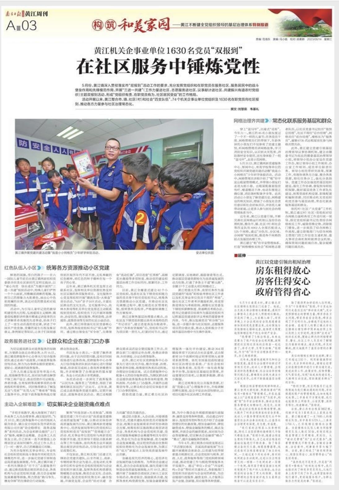 活动开展以来,黄江整合市、镇、社区(村)和社会“四支队伍”,74个机关企事业单位党组织及1630名在职党员向社区报到,推动各方力量参与社区治理常态化。