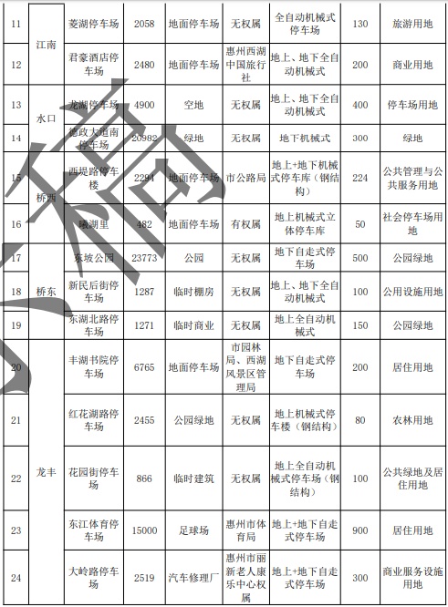 惠城区规划新增公共停车场247处,可提供车位数约6.1万个。其中,控制性停车场56个,兼容性停车场108个,弹性停车场83个。建议以上公共停车场适当兼容非机动车停车位,以满足非机动车停车需求。