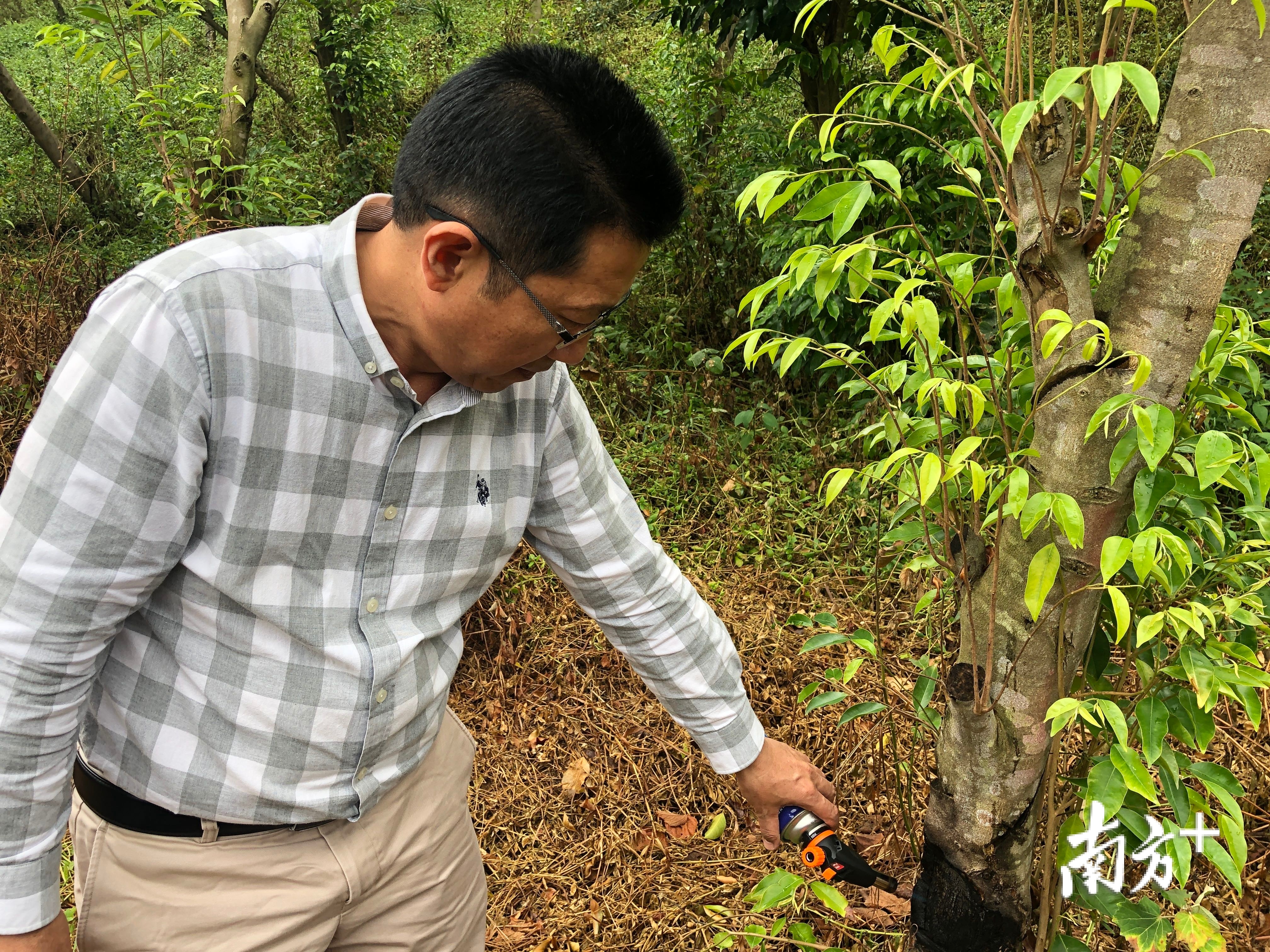 “闻到香味了吗?”隆瀚生态董事长李战举起喷火枪喷向一棵沉香树根部。不一会,一股异香扑面而来,沁人心脾,这就是沉香原始的香味。原来,沉香是沉香树受到动物啃噬、火烧、刀伤等外在伤害后,在自我修复过程中分泌出的油脂受到真菌感染所凝结成的分泌物。
