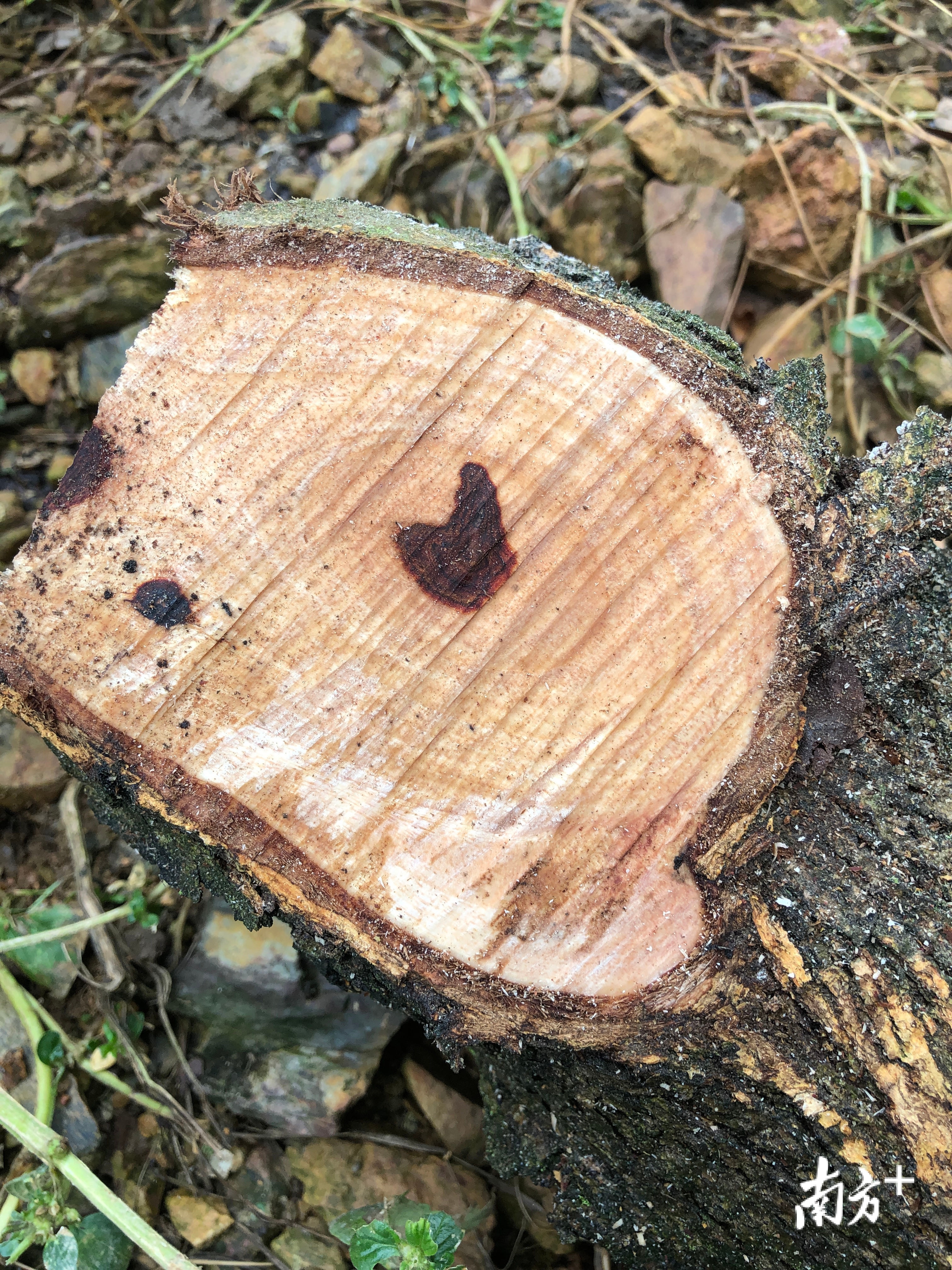 “隆瀚生态产出的沉香,都是通过人工物理结香的方式而产出的。”李战站在沉香树下用脚拨开草丛,这里周围有一圈明显的沟壑,这是沉香树断根处理后的痕迹,以促进沉香树的侧根生长。而在11月之后,对于直径10厘米以上的沉香,就要进行破口处理,一棵树大概破5到8个口子,以促进它物理结香。