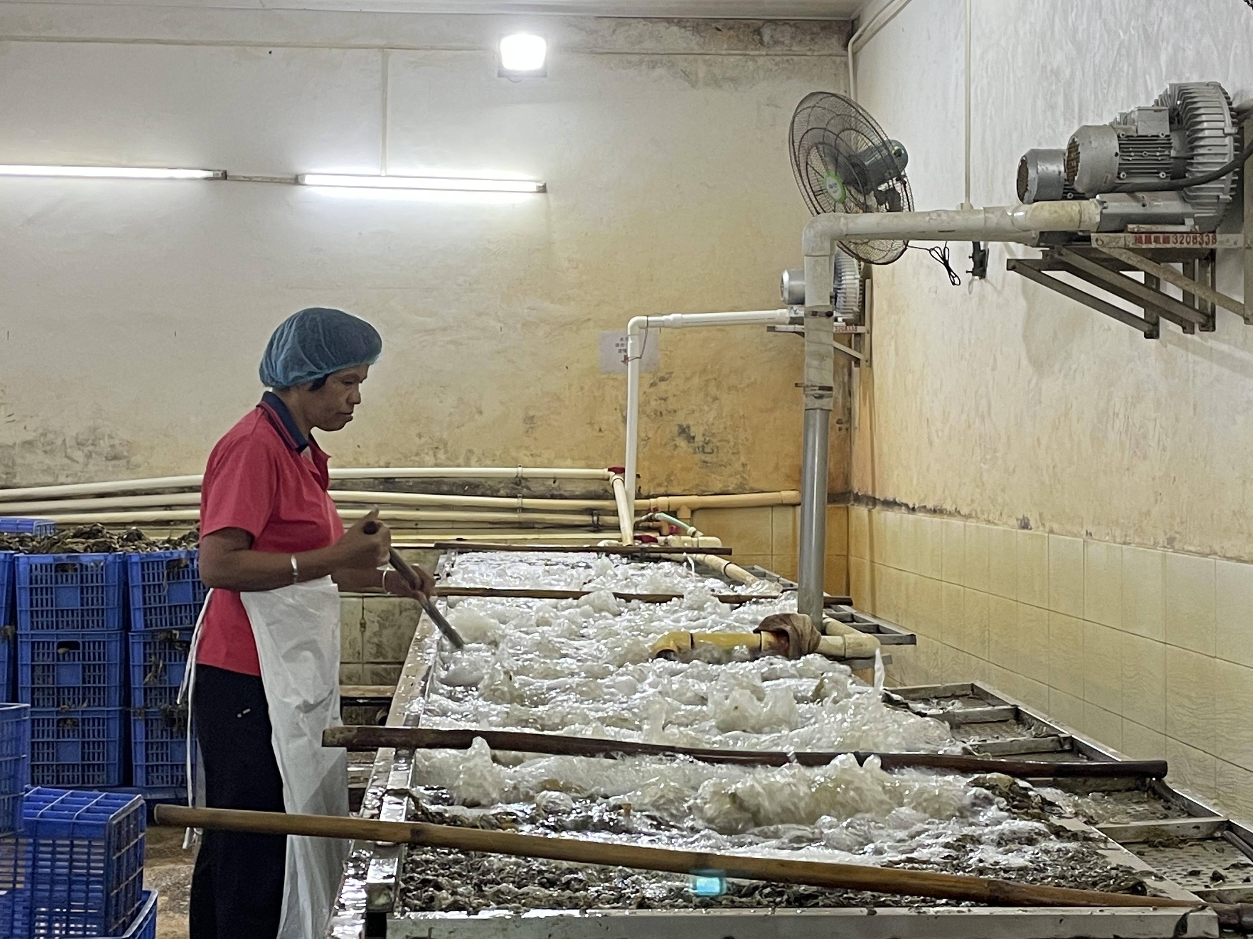 除了梅菜种植,深加工的功夫也是重头戏。2015年,环通梅菜新建厂房,除仓库、加工车间外还有消毒间,工人把装袋好的梅菜放入锅炉进行蒸煮消毒,每一批梅菜都要进行检验,看盐分、糖分、水分、亚硝酸盐、大肠杆菌等指标是否合格。