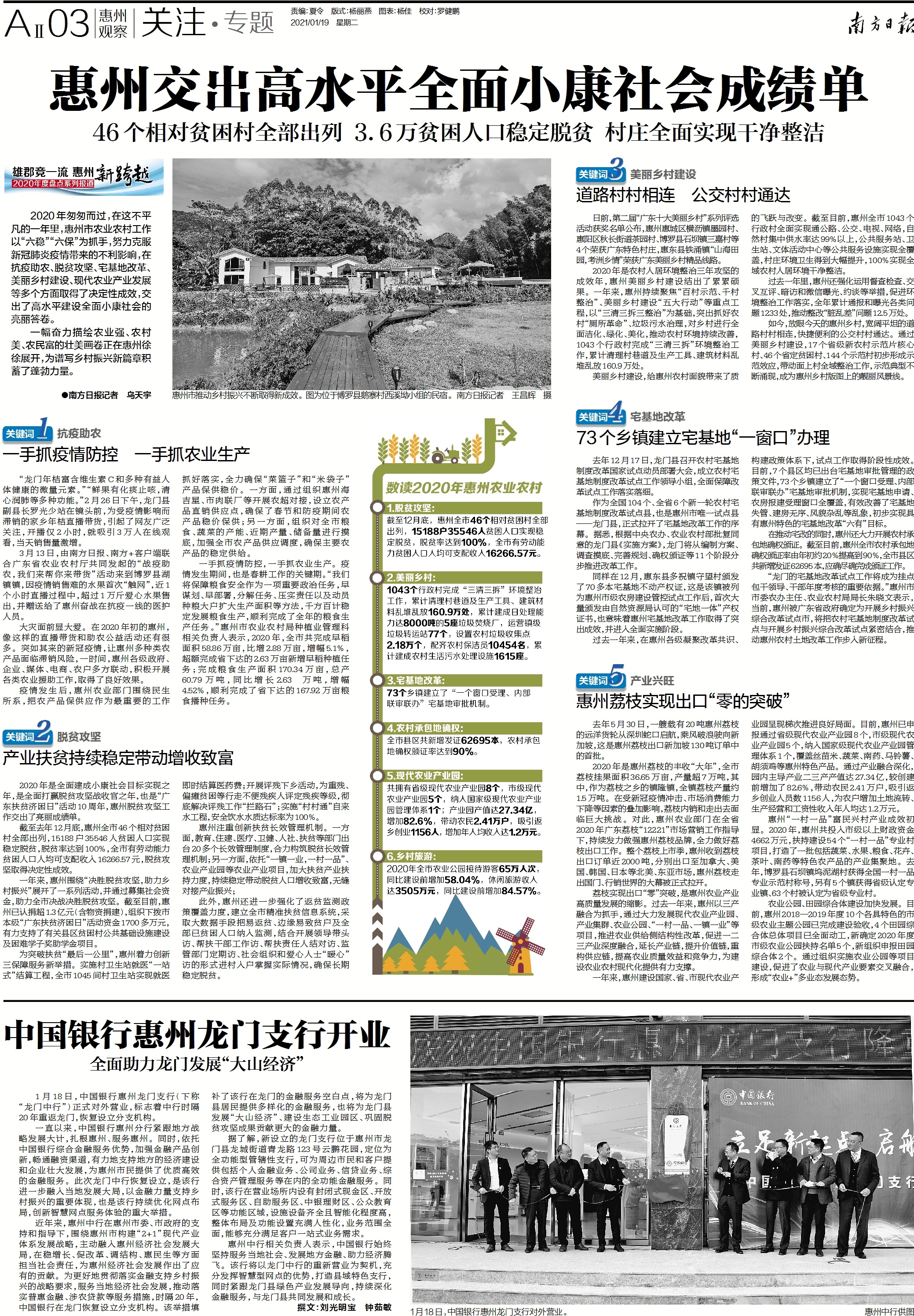 截至去年12月底,惠州全市46个相对贫困村全部出列,15188户35546贫困人口实现稳定脱贫,脱贫率达到100%,全市有劳动能力贫困人口人均可支配收入16266.57元,脱贫攻坚取得决定性成效。