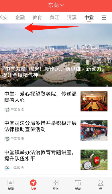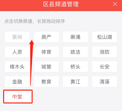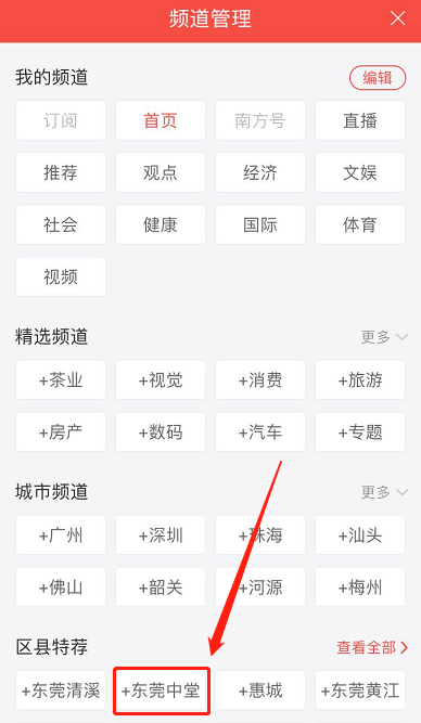 2、进入频道管理页面,找到“区县推荐”,点击“东莞中堂”。