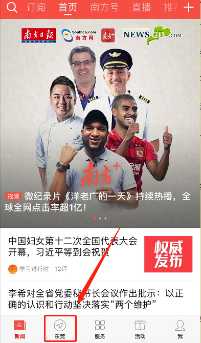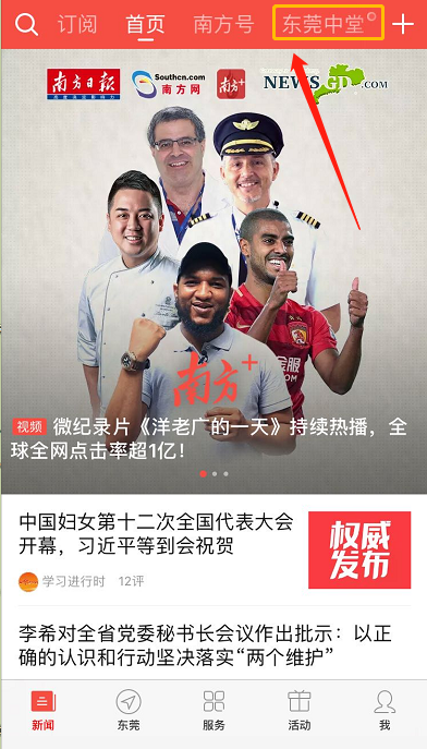 1、下载并打开南方+新闻客户端,在页面下方选择城市“东莞”,进入东莞要闻频道。