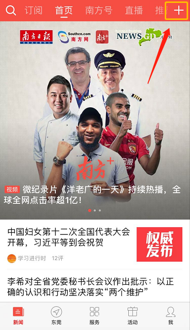 1、下载并打开南方+新闻客户端,点击页面右上角的“+”号。