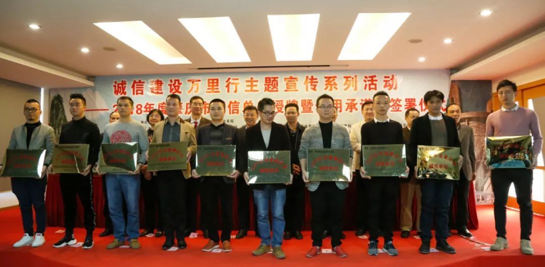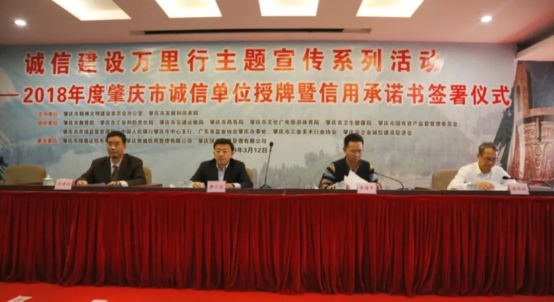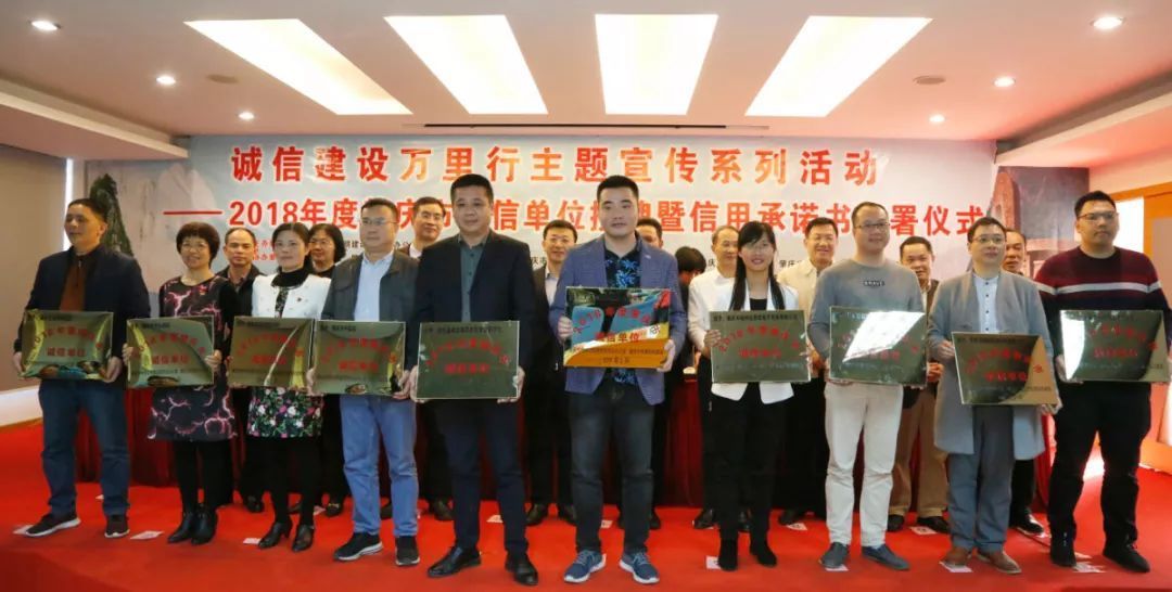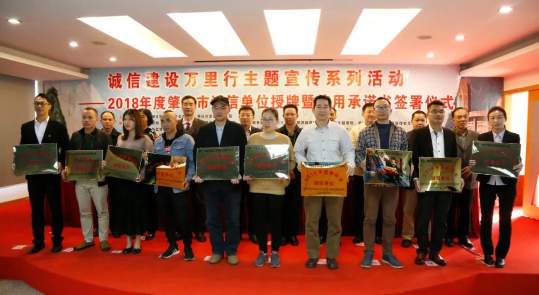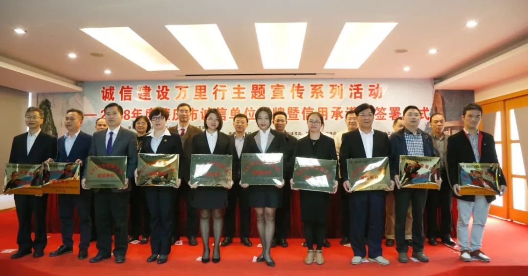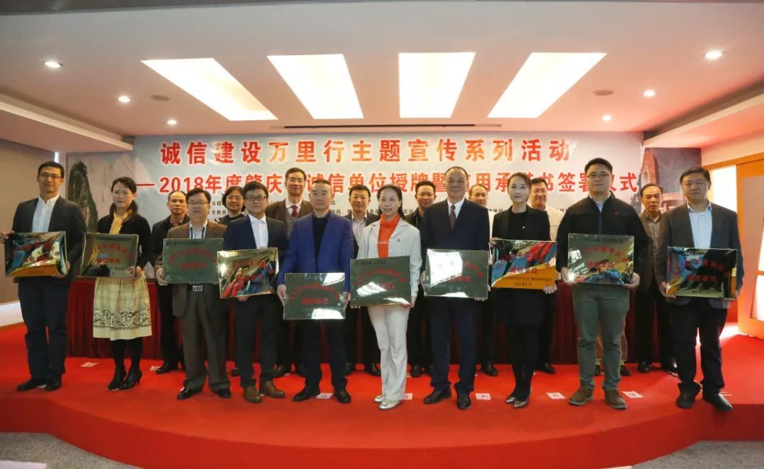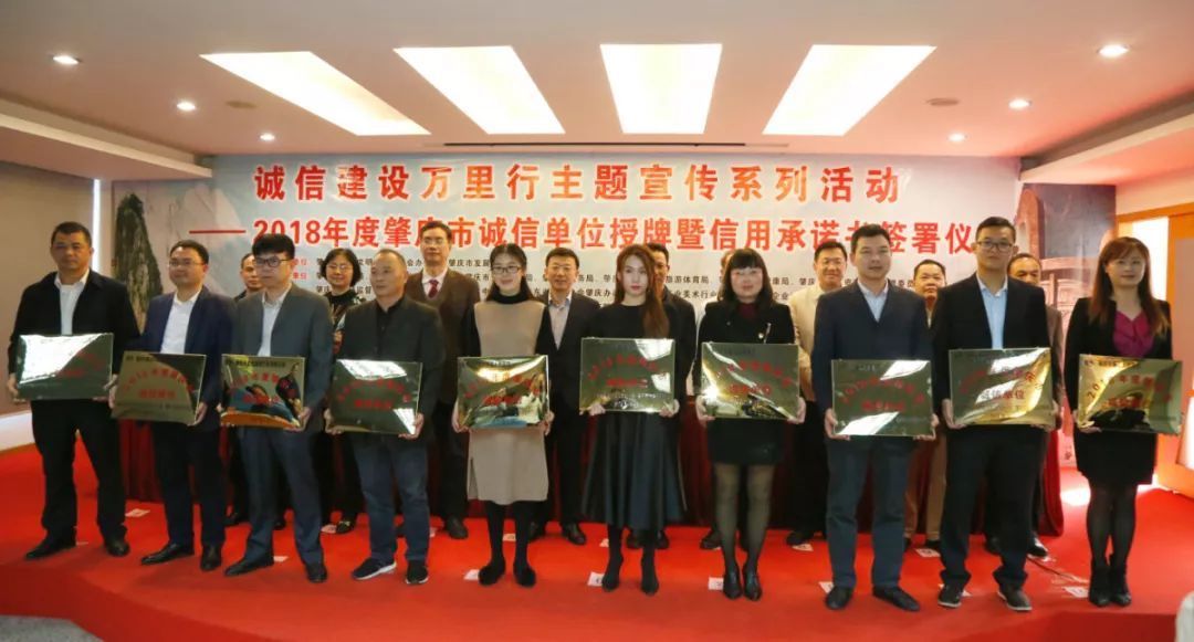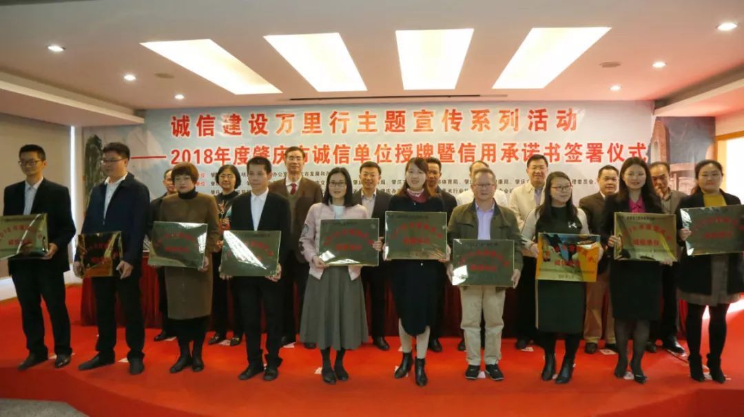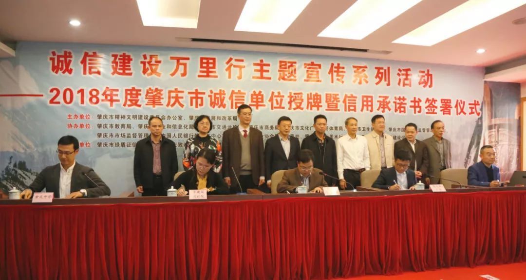 3月12日,肇庆市文明办、市发展改革局联合相关部门、相关行业协会共同举办2018年度肇庆市诚信单位授牌暨信用承诺书签署仪式。