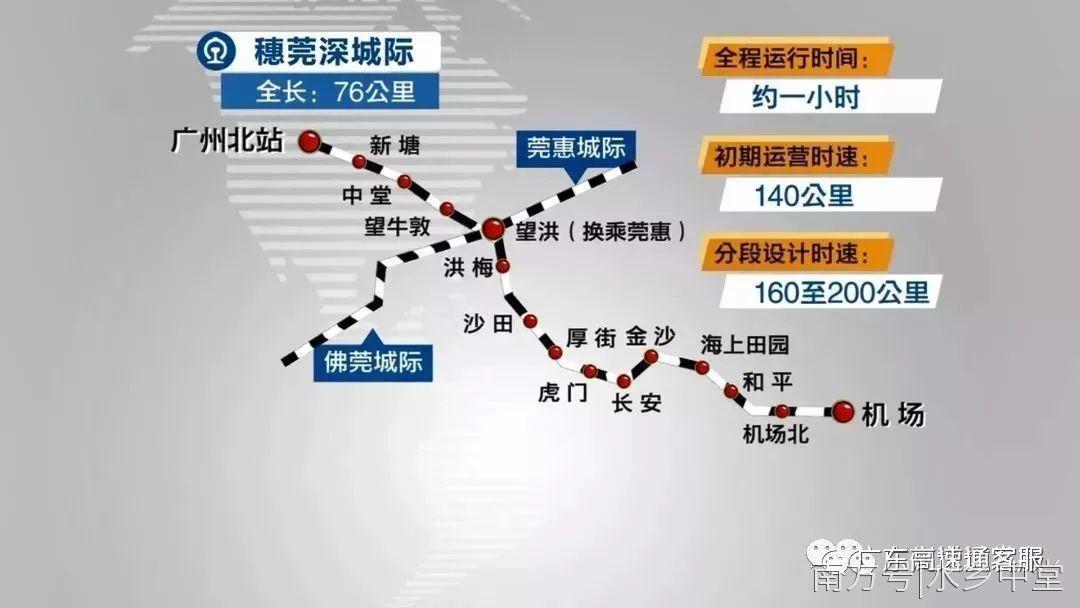 中堂站可达东莞西站(望洪),未来可以换乘佛莞城际轨道交通、东莞城市轨道交通R1线;在虎门可以交汇广深港高速铁路、东莞轨道交通R2线。