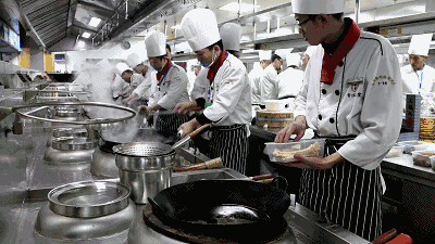 每个参赛队由同一单位的三名选手(1主厨+2助理)组成,根据每场赛制要求制作菜肴,每款菜肴按百分制评分(菜肴成绩的平均分即为菜肴制作的成绩),团队赛排名以各队得分从高到低排列,团队赛不进行理论知识考核。