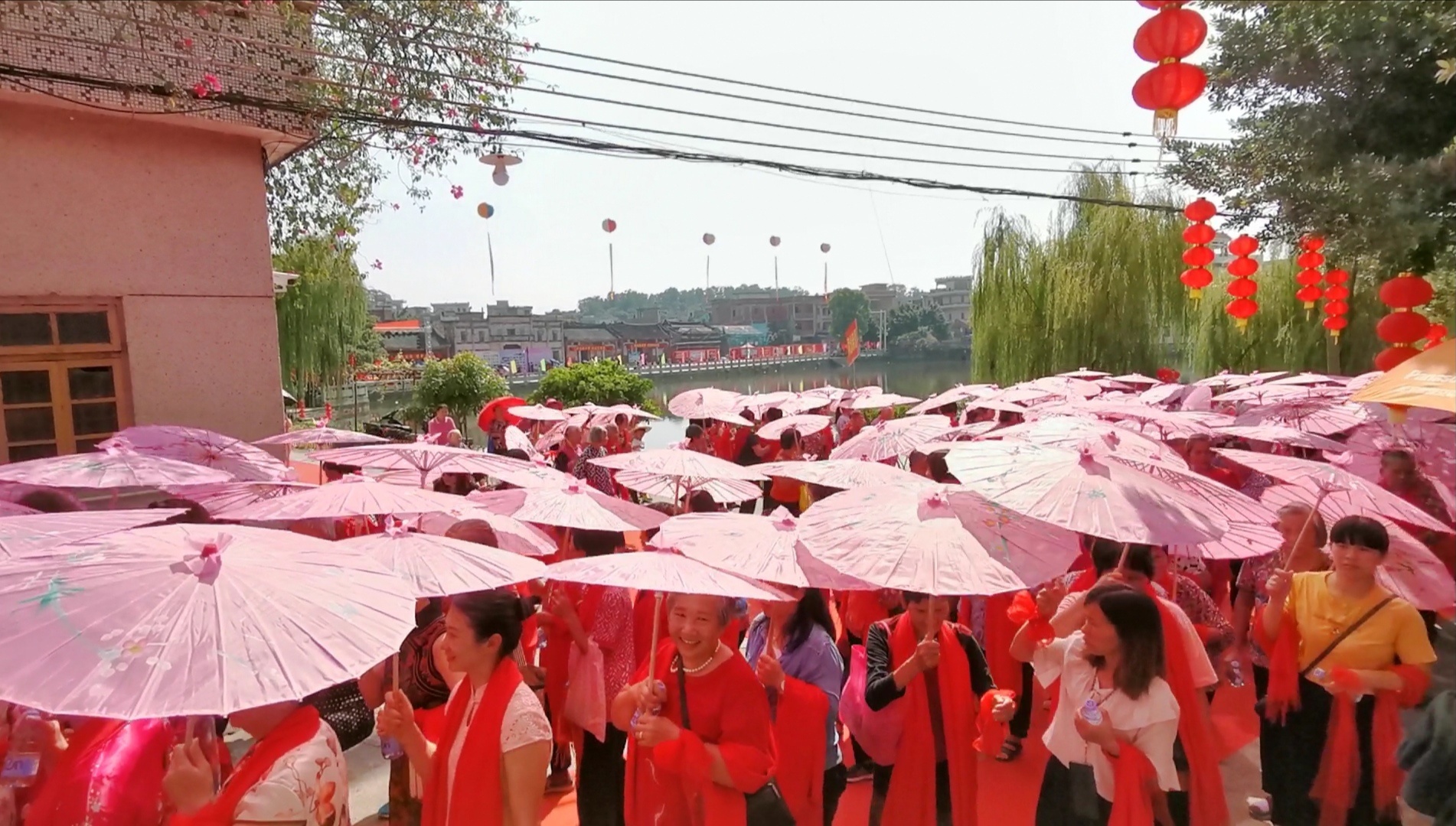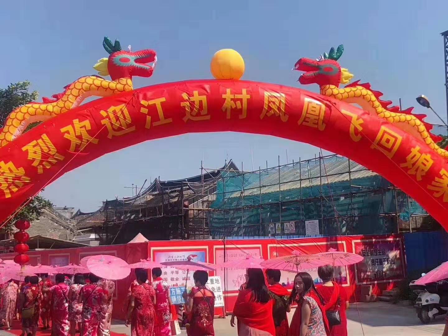 当天,在江边古村,随处可见的红石灰砖、飞檐翘角、麻石巷道,在红气球、红灯笼、大拱门衬托下,显得一派喜气祥和。飘扬的红丝带上写着“欢迎江边村凤凰飞回娘家”“共思乡情,同念亲恩”等标语,外嫁女们有的身穿旗袍,有的系着红色丝带,还有不少人身穿红衣,在锣鼓声中,盛装的妇女从各地汇聚一起,在古朴厚重的古村巷道内“”走秀,逢老人问好、遇邻里闲谈,吸引了众多路人围观和拍照。