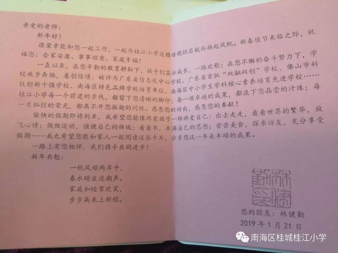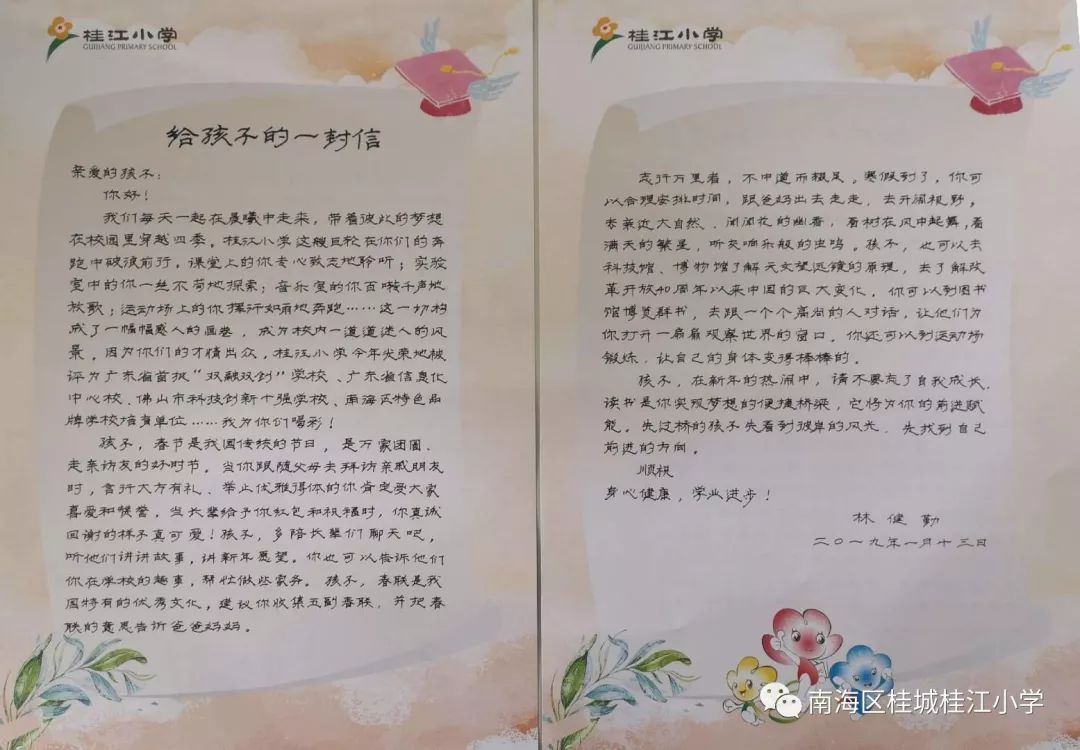 “亲爱的孩子:我们每天一起在晨曦中走来,带着彼此的梦想在校园里穿越四季。桂江小学这艘母舰在你们的奔跑中破浪前行……”放假前夕,学校3600位孩子都收到林健勤校长亲笔手写的一封信,这是一份最珍贵的新年礼物!