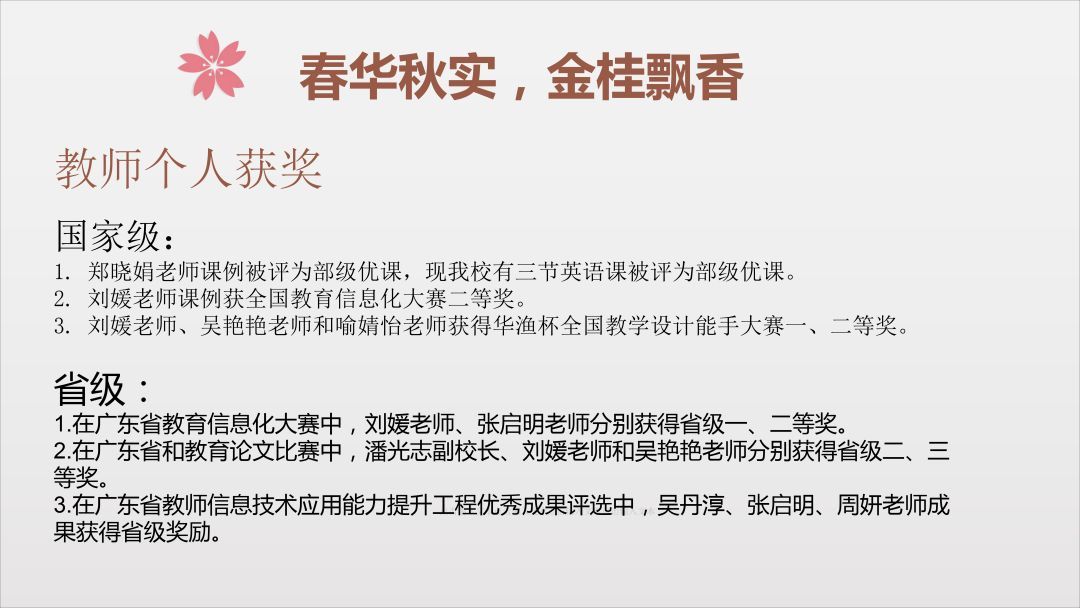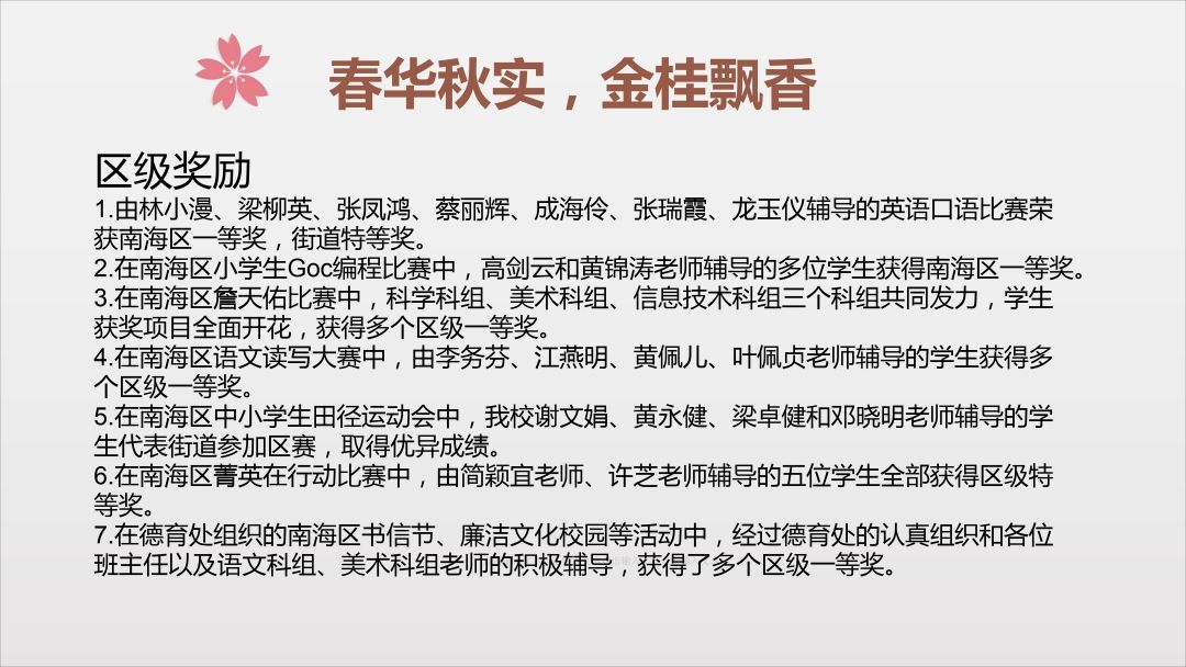 为提升青年教师教学技能,培养青年教师学科教学素养,促进青年教师的快速成长,我校组织多名青年教师分别参加各学科街道、区的教学技能大赛,成绩斐然:我校所有学科均有老师荣获街道各级奖励。最终,张英华、喻婧怡、冯柳叶、吴碧松、张启明、黄贵鲜、符芷茵、许芝等老师荣获该学科南海区前十名,张英华荣获信息技术学科教学技能大赛南海区状元!