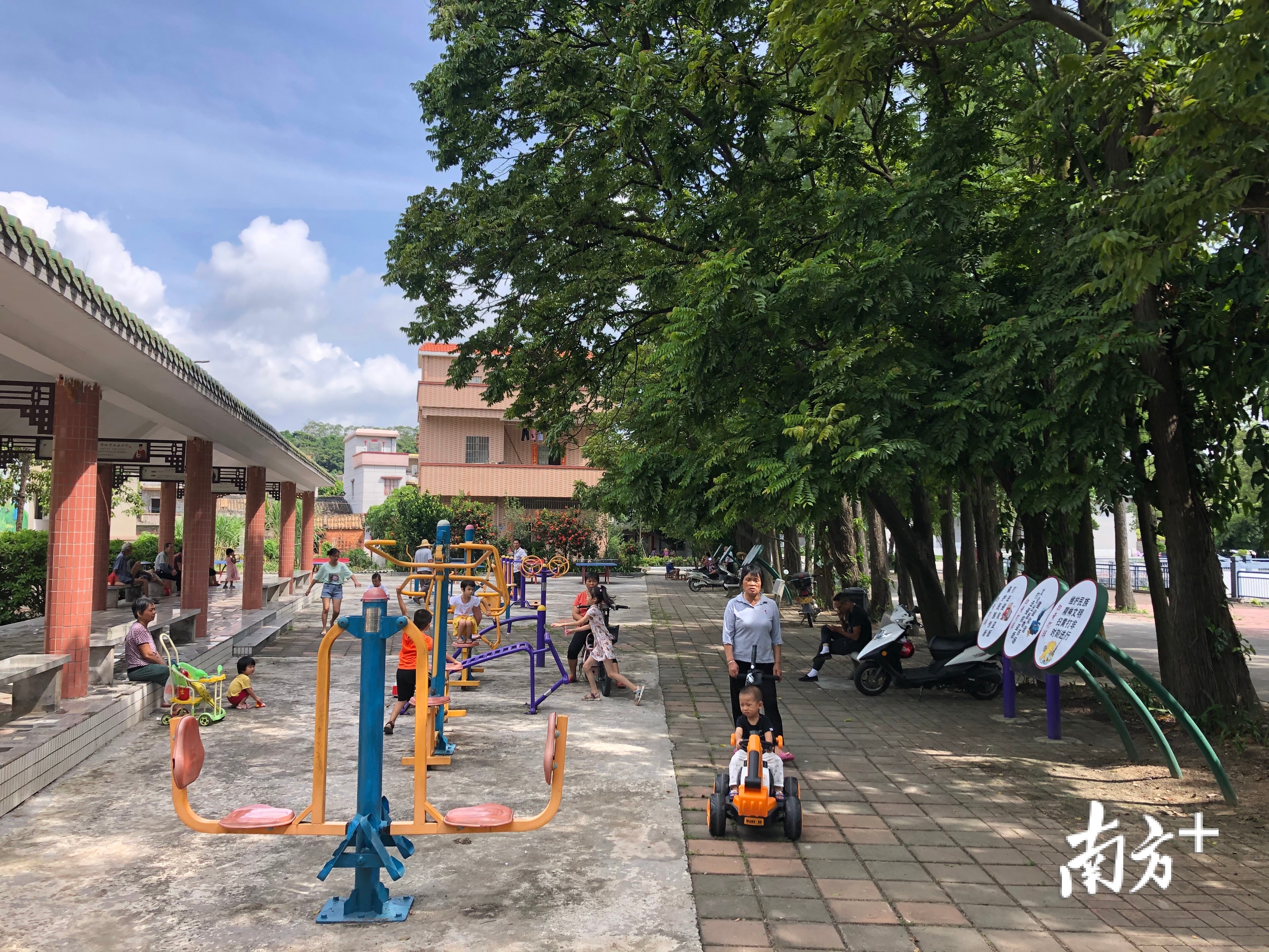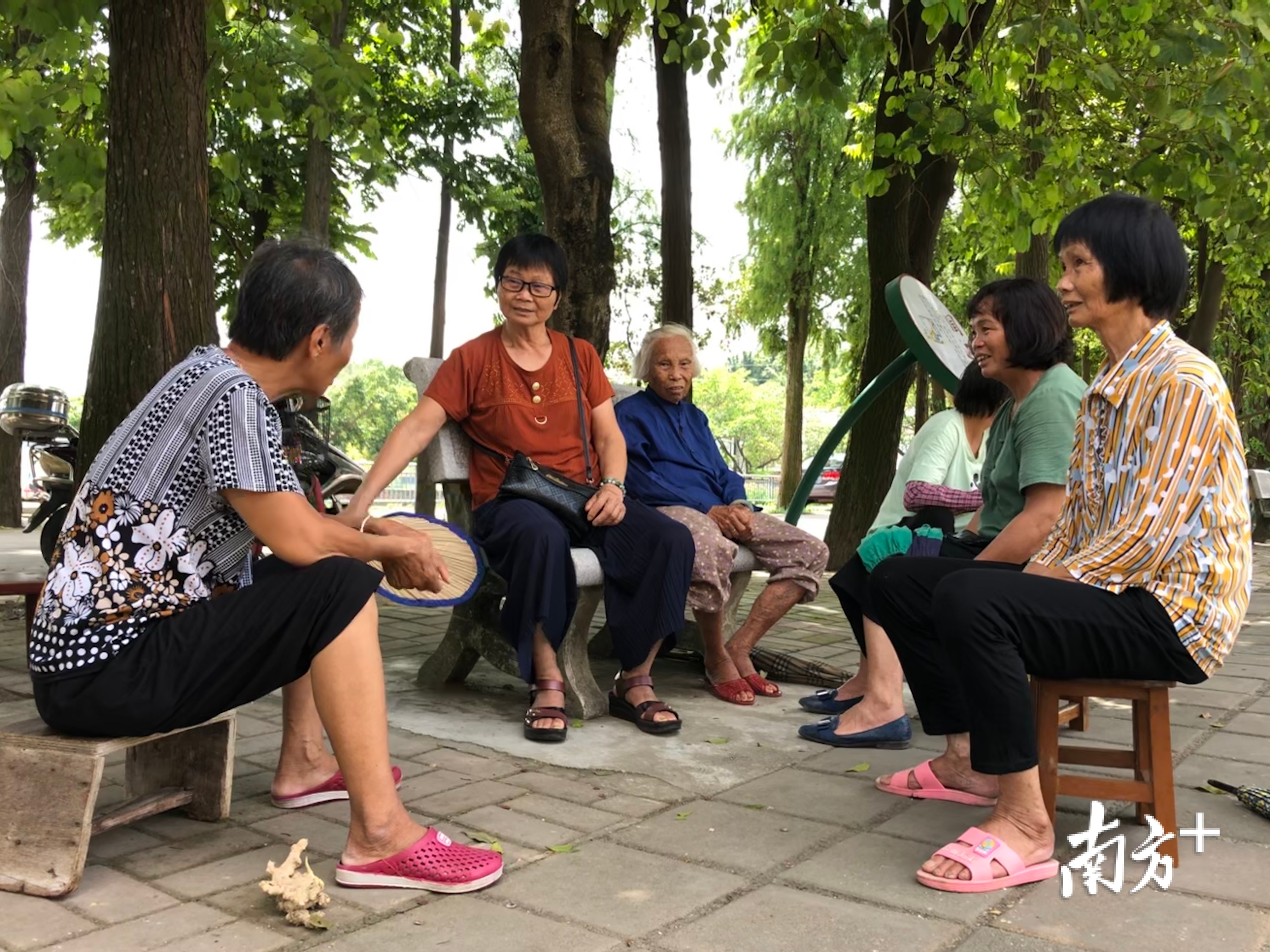 8月10日的江门鹤山市来苏村,天气闷热。来苏文化广场边聚集了不少人,多半是上了年纪的妇女,坐在石凳上乘凉。