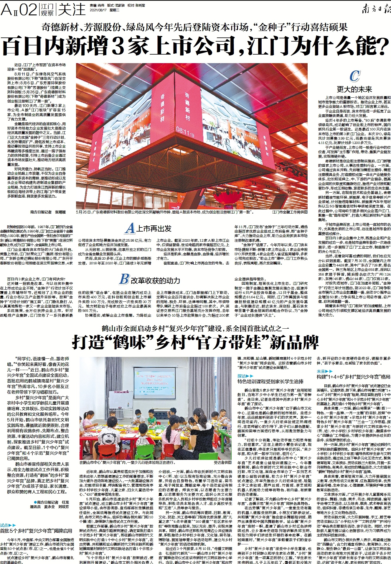 今年5月,中宣部、中央文明办部署全国推进乡村“复兴少年宫”建设工作,鹤山市被列为全国首批50个试点县(市、区)之一,也是全省5个试点县(市、区)之一。