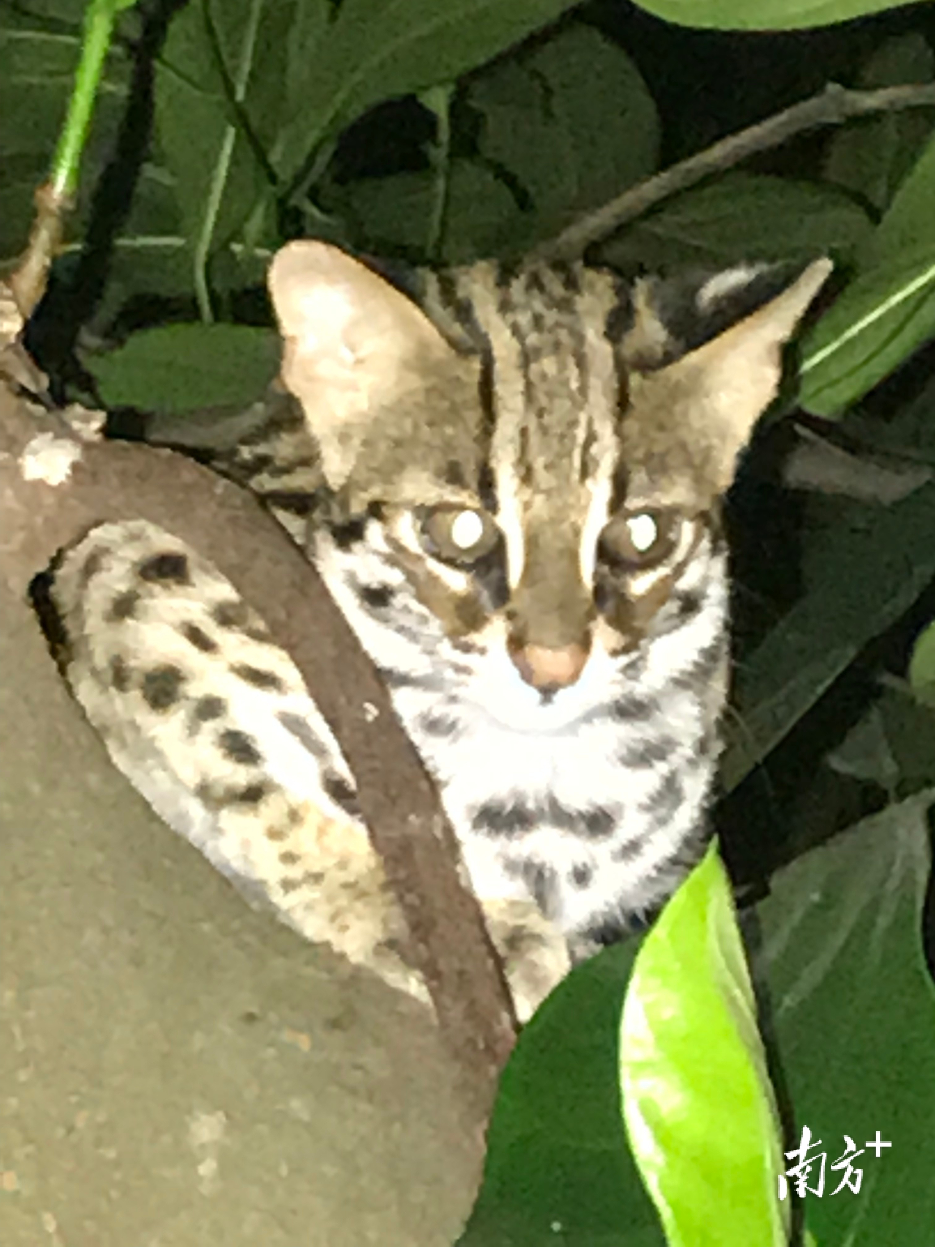 据了解,豹猫是体形较小的食肉动物,略比家猫大,耳背有淡黄色斑,全身背面体毛为浅棕色,布满褐色斑点,胸腹部及四肢内侧为白色,尾背有褐斑点或半环,尾端为黑色或暗灰色。豹猫生存于林地、草坡、灌丛和荒山等自然环境,主要以鼠类、小型鸟类、昆虫等为食。