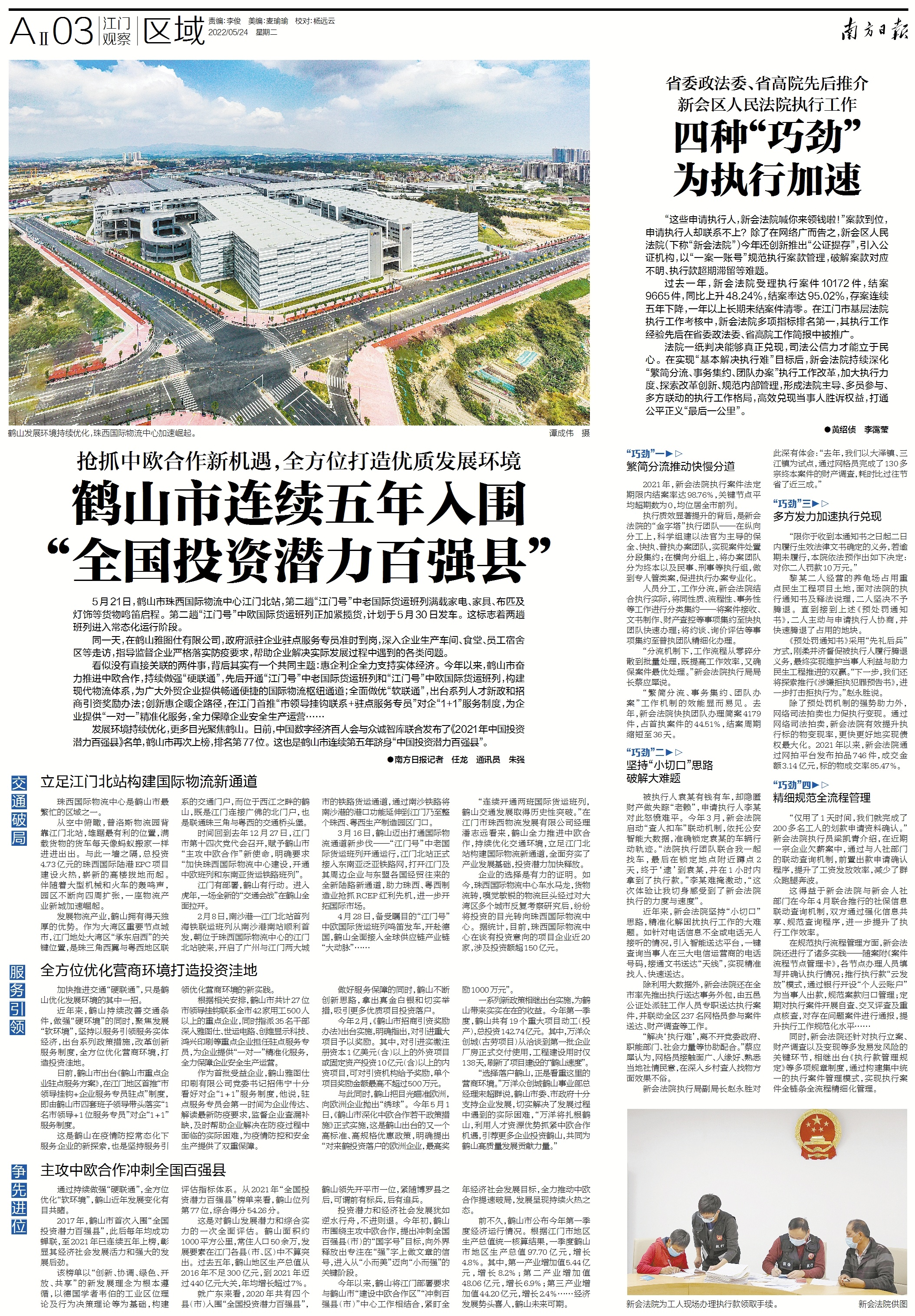 看似没有直接关联的两件事,背后其实有一个共同主题:惠企利企全力支持实体经济。今年以来,鹤山市奋力推进中欧合作,持续做强“硬联通”,先后开通“江门号”中老国际货运班列和“江门号”中欧国际货运班列,构建现代物流体系,为广大外贸企业提供畅通便捷的国际物流枢纽通道;全面做优“软联通”,出台系列人才新政和招商引资奖励办法;创新惠企暖企路径,在江门首推“市领导挂钩联系+驻点服务专员”对企“1+1”服务制度,为企业提供“一对一”精准化服务,全力保障企业安全生产运营……