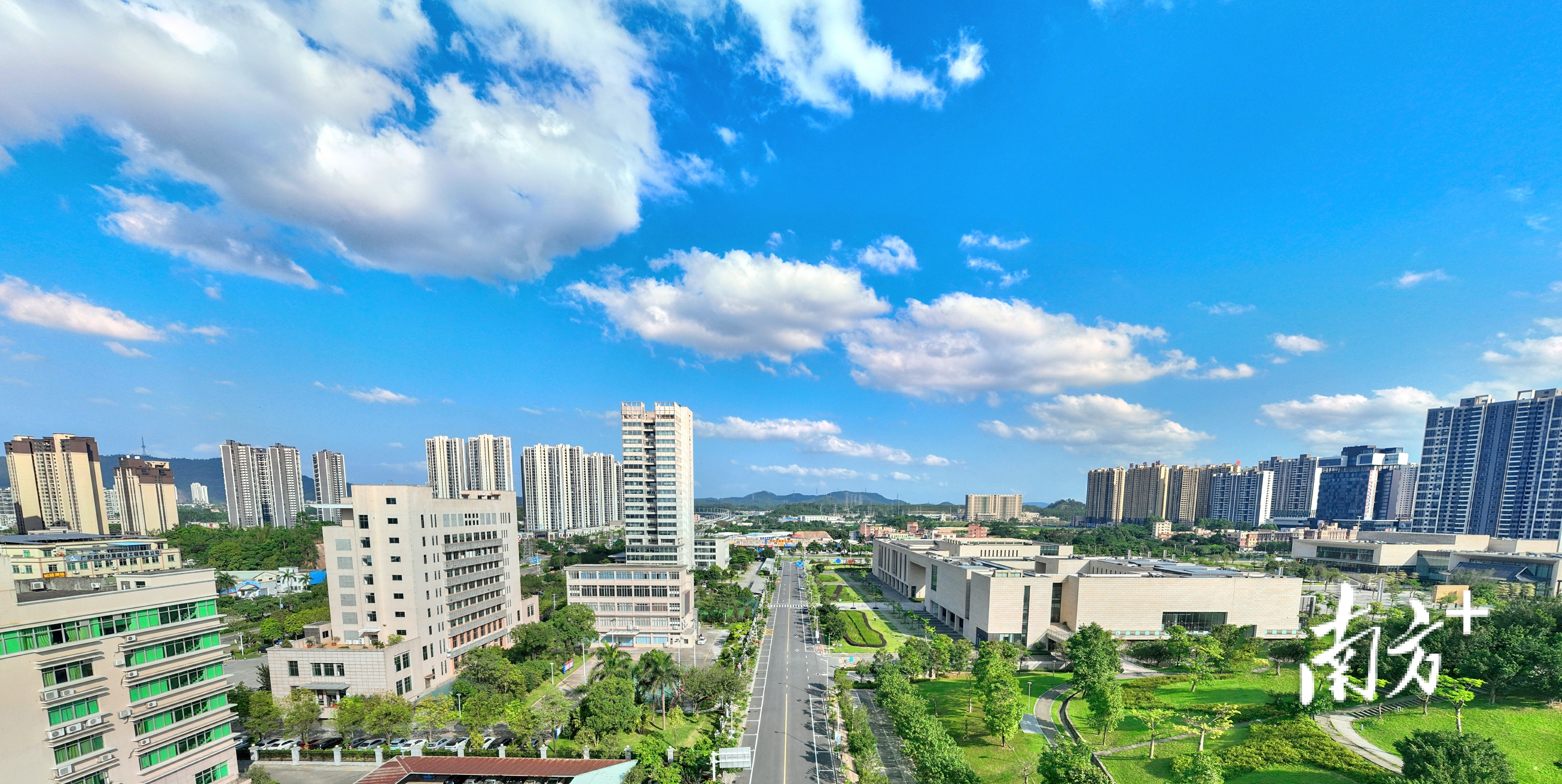 临近正午,蓝天白云与城市建筑交相辉映。