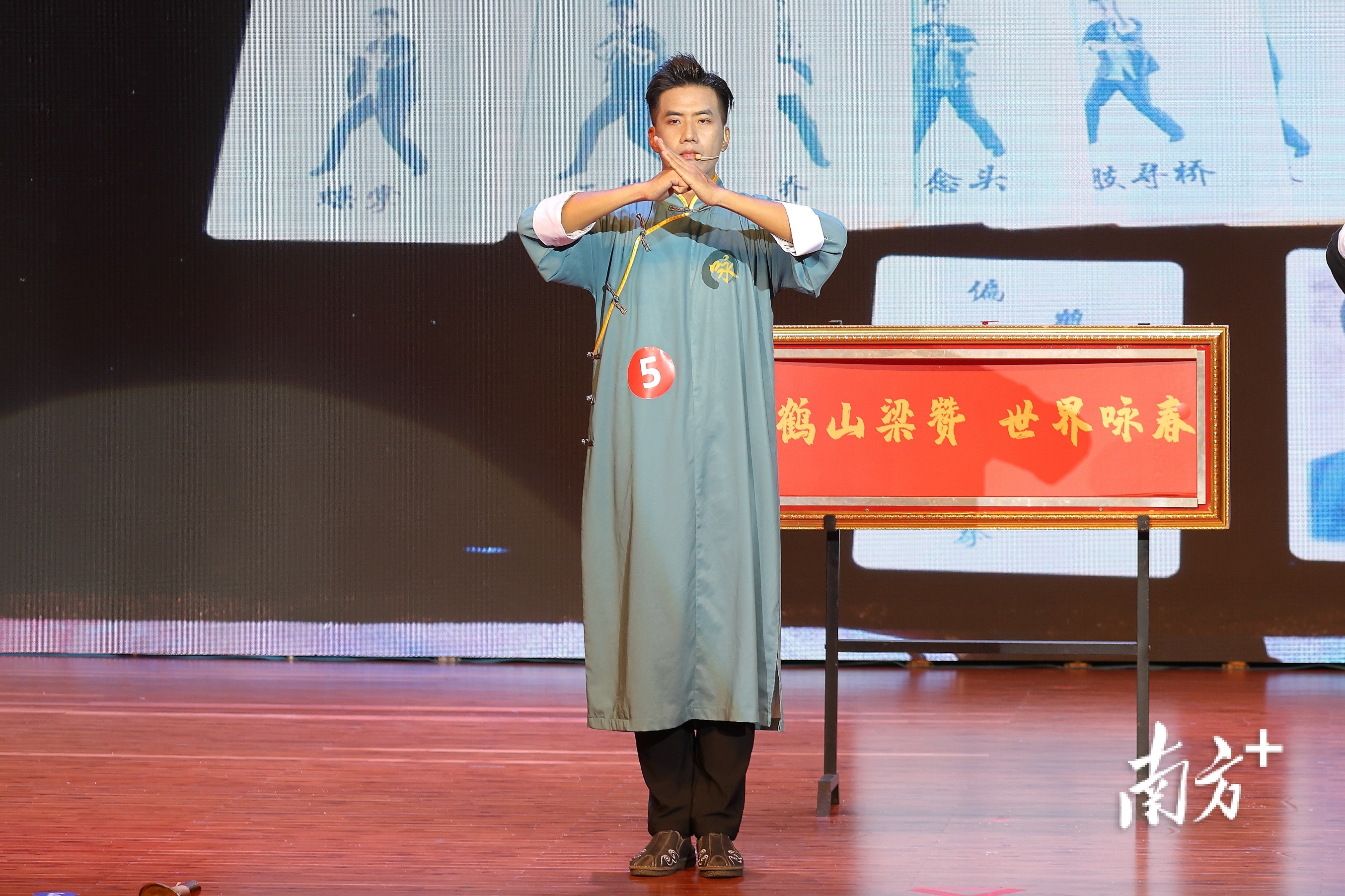 模拟讲解时,舞台大屏幕播放的,并非预先录制的视频,而是他现场表演的扑克牌魔术。只见他把牌正面向上摊开,观众看到一副普通扑克。随后他用起“魔法”,方块J盖上再翻开,竟变成一代武术宗师梁赞的画像。他继续“施法”,手上扑克牌显现出古劳偏身咏春十二式、古劳咏春传人等图案。伴随着扑克牌图案的变换,他将古劳咏春拳的历史渊源娓娓道来。他还现场表演一段古劳咏春,边耍拳,边讲拳。最后揭开台上牌匾,亮出“鹤山梁赞 世界咏春”八字,赢得阵阵掌声。